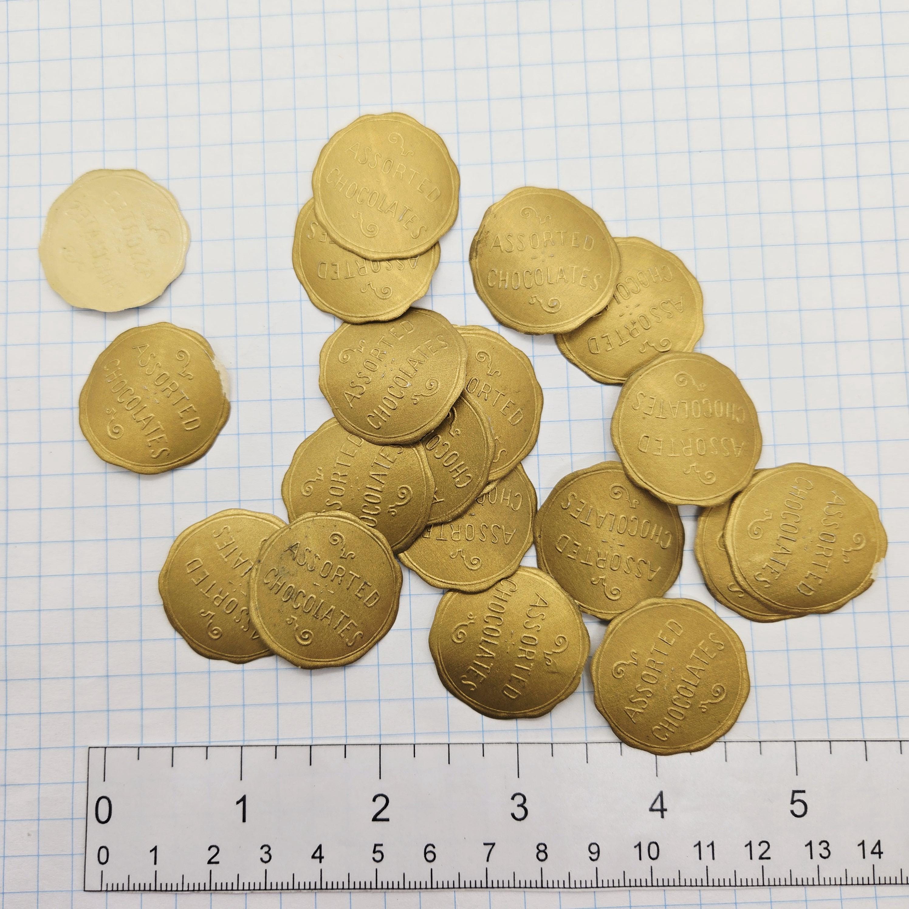 20 yummy chocolate foil labels.....Unused but old, just a smidge over 1 inch in diameter, gold foil type. Great for ATC's, cards and collages!
