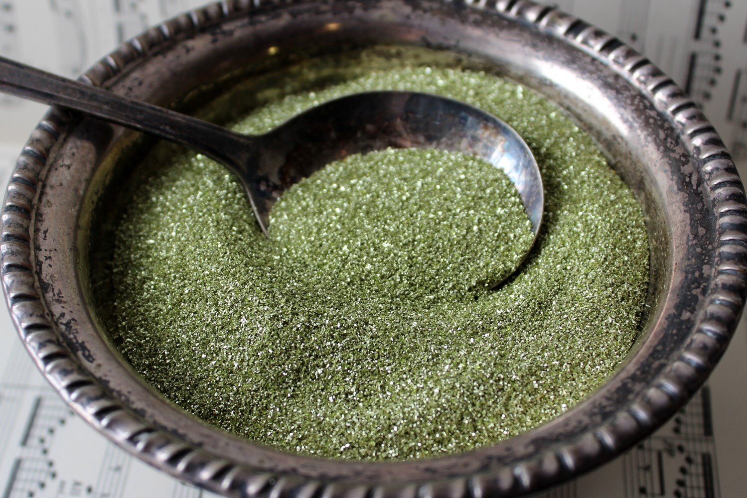 1/2 oz of finely crushed German Glass Glitter in Lime Green. What the pros use, once you've tried the real glass glitter, you'll be spoiled. :-)