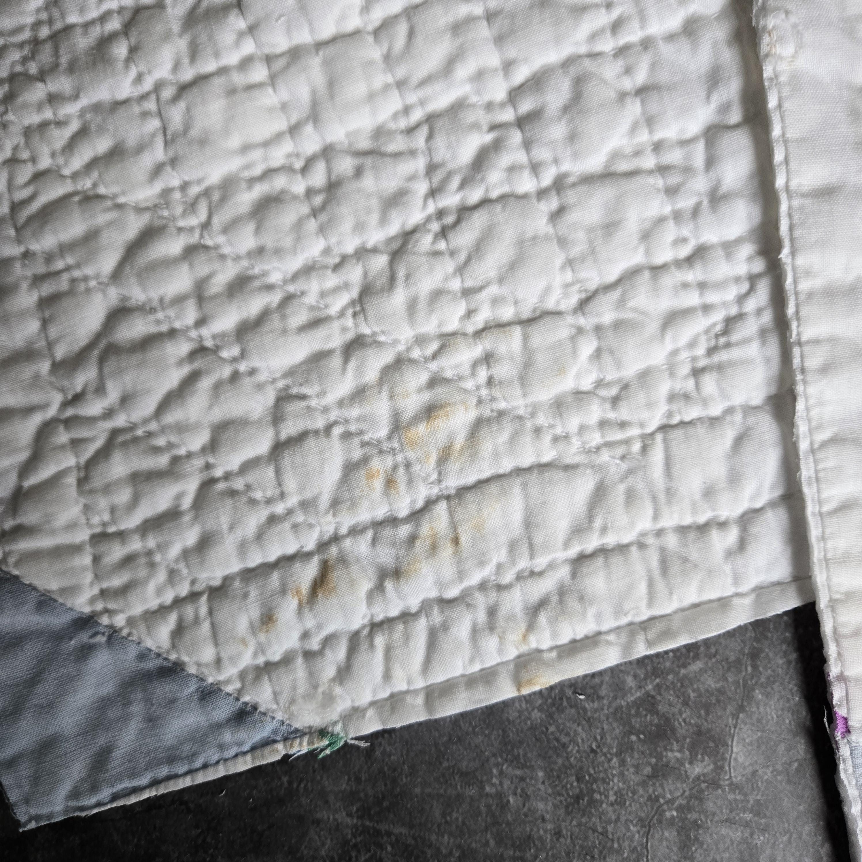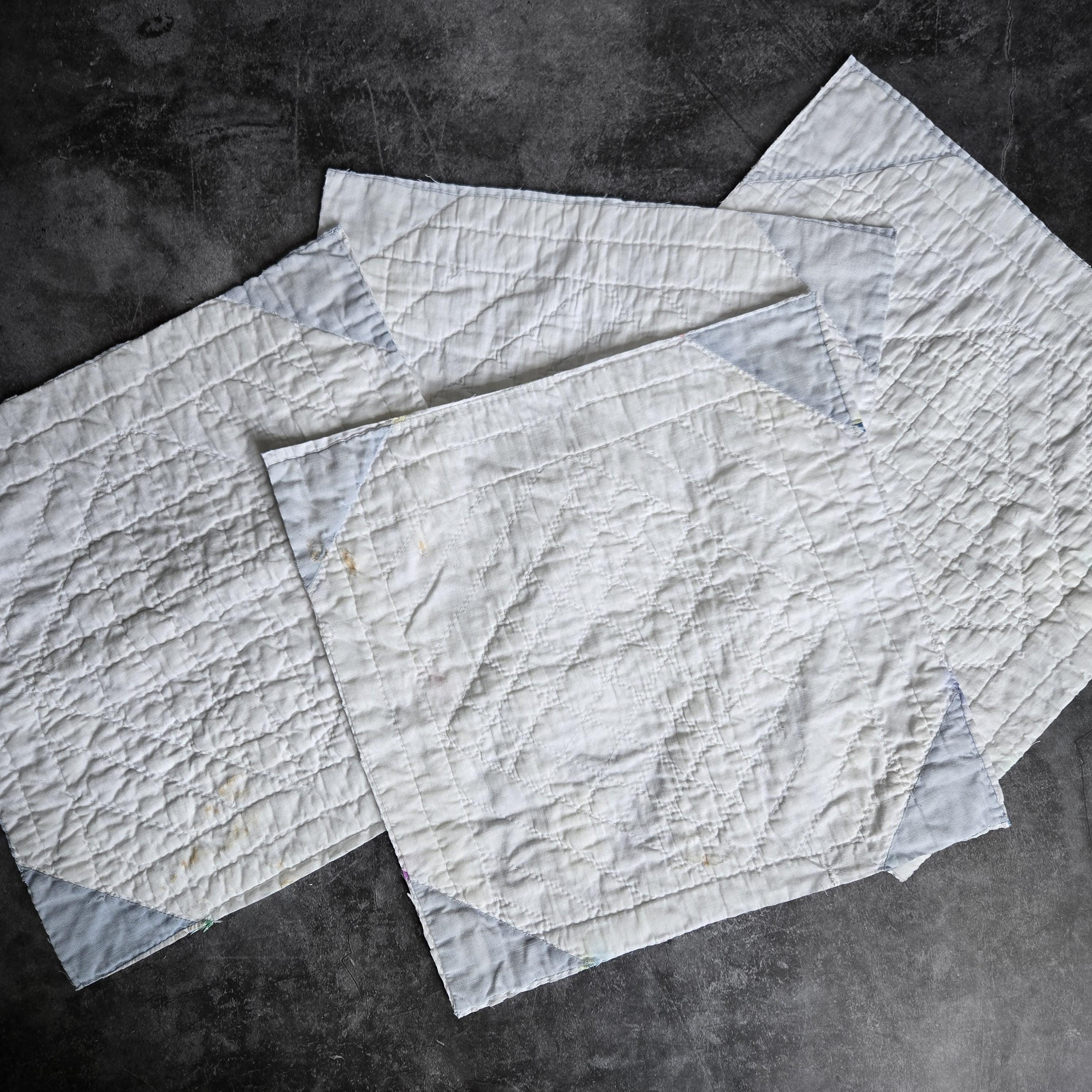 2 square pieces cut from an old quilt, white cotton with blue cotton corners on one side.