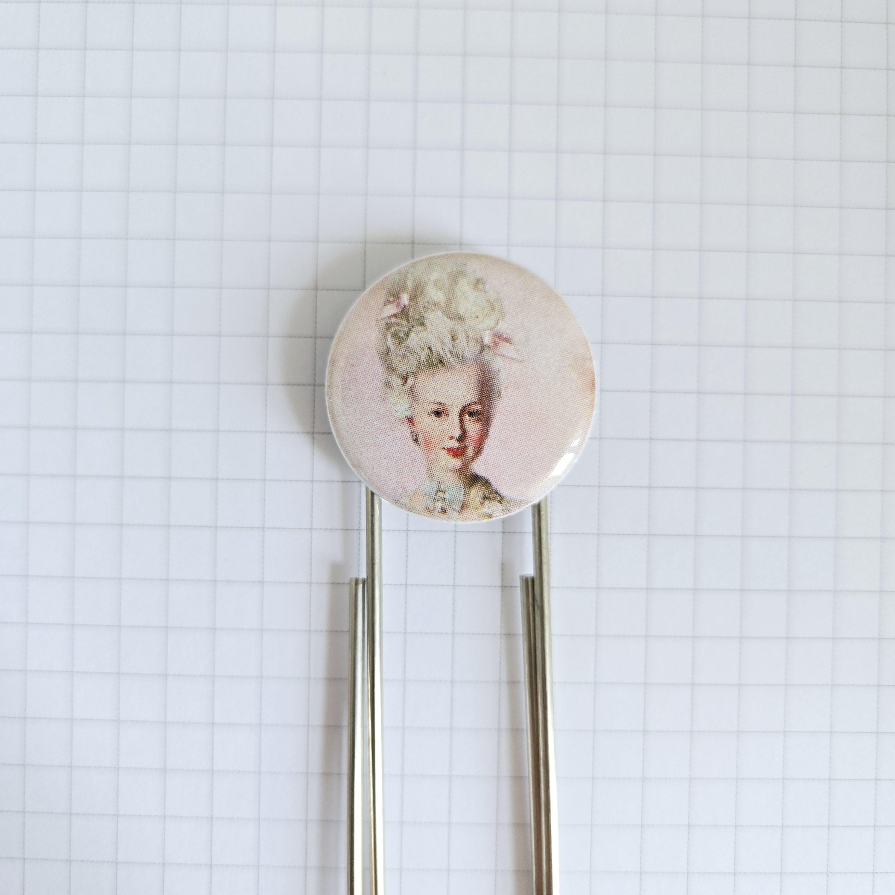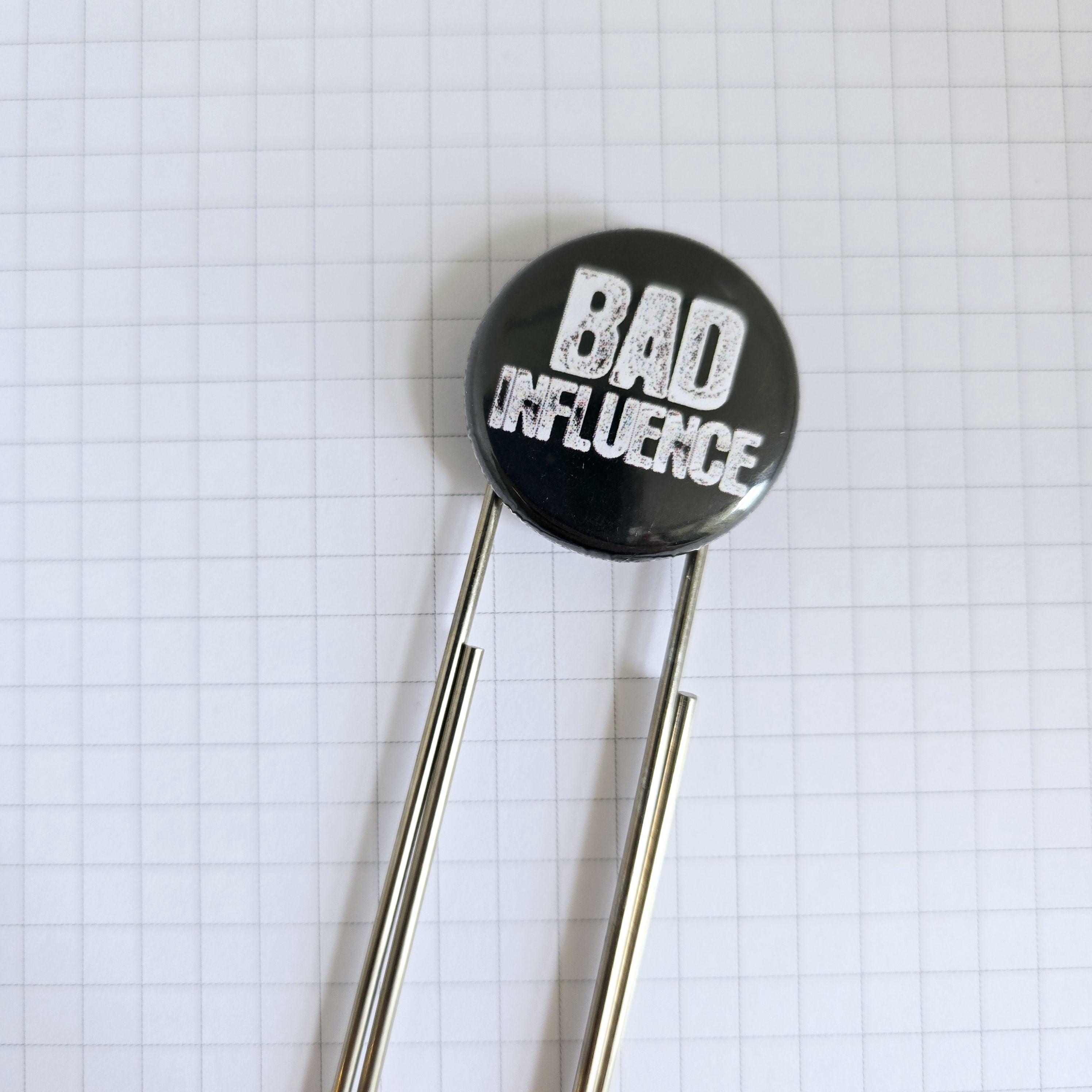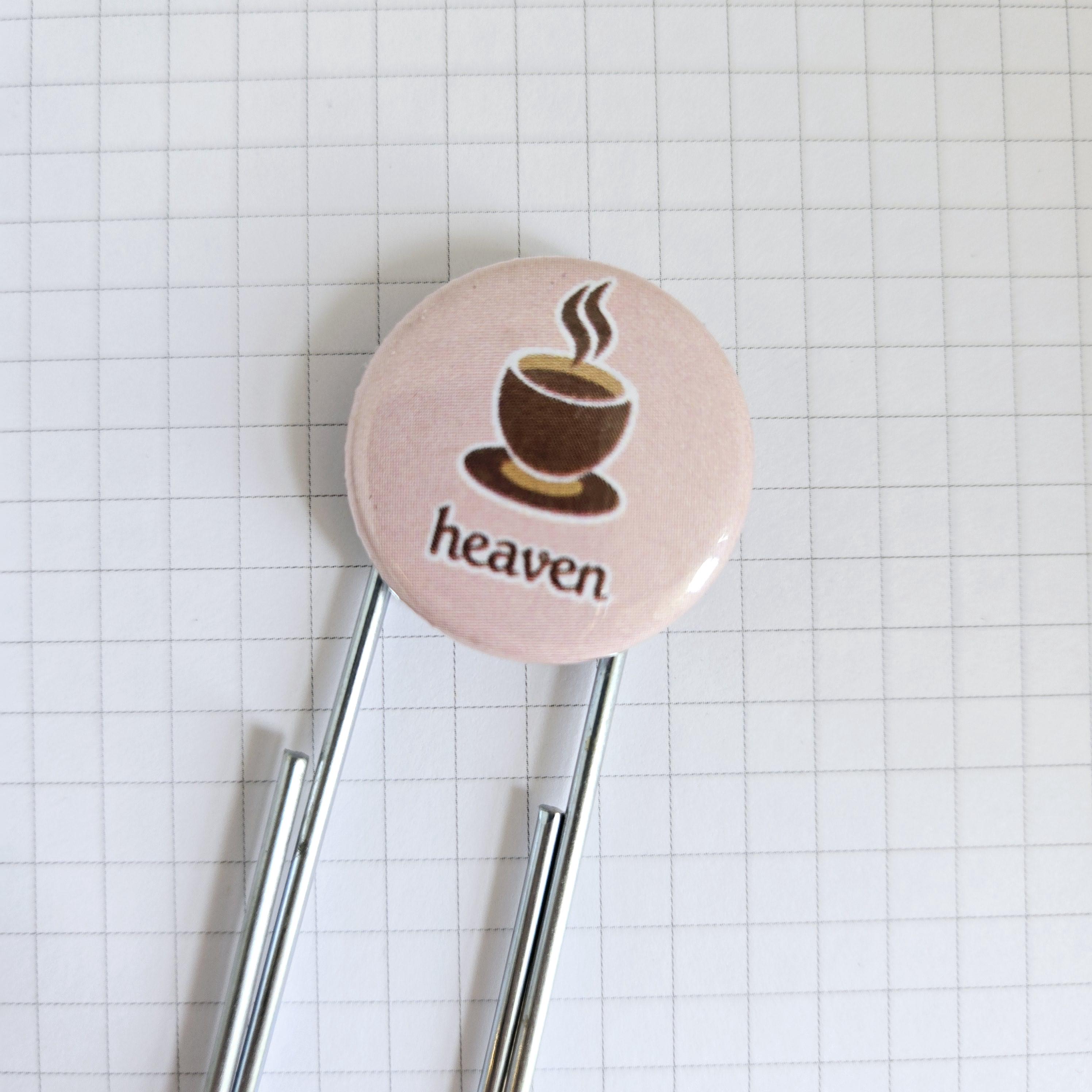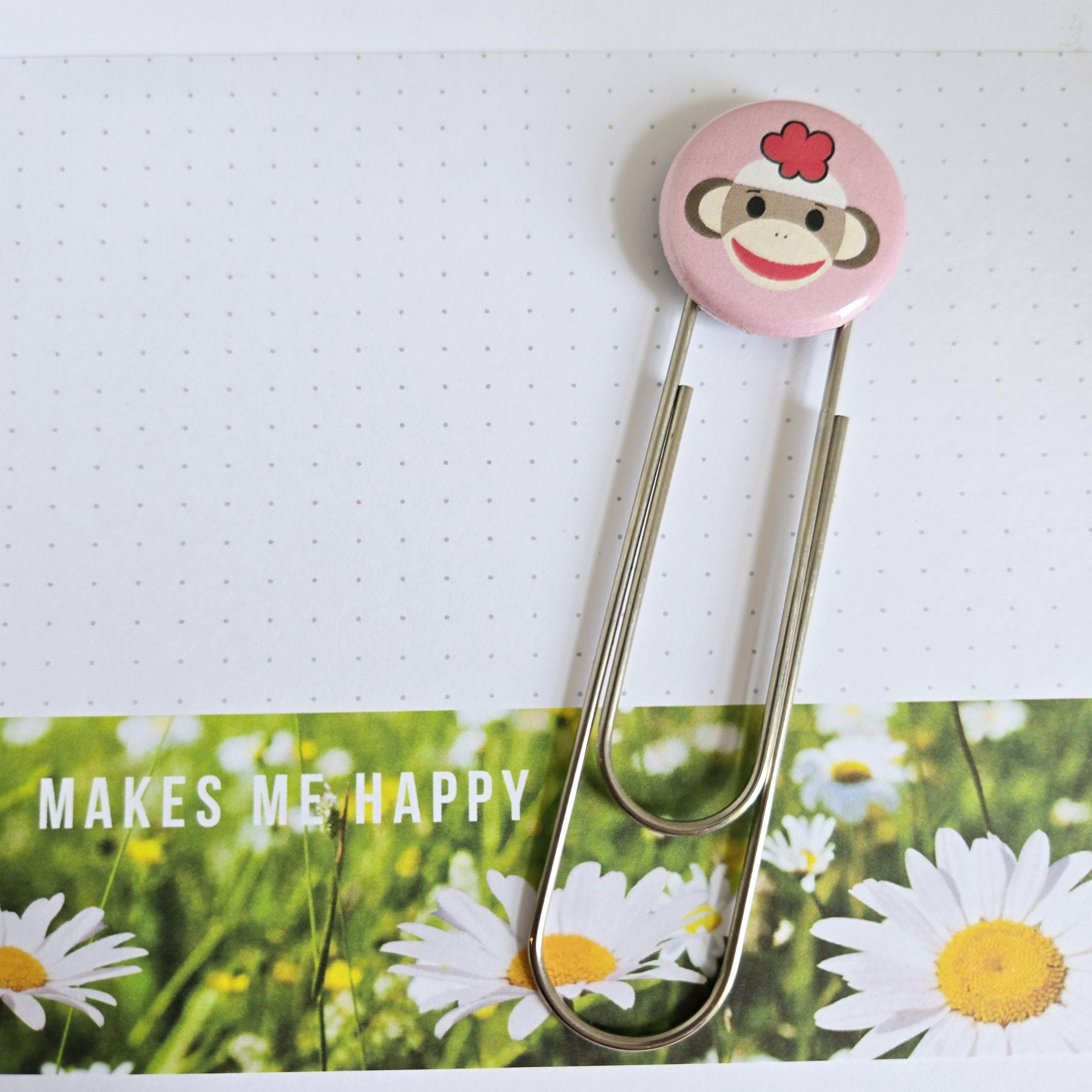 Jumbo metal paper clip bookmark, featuring a one inch metal & paper round decoration covered in mylar plastic.