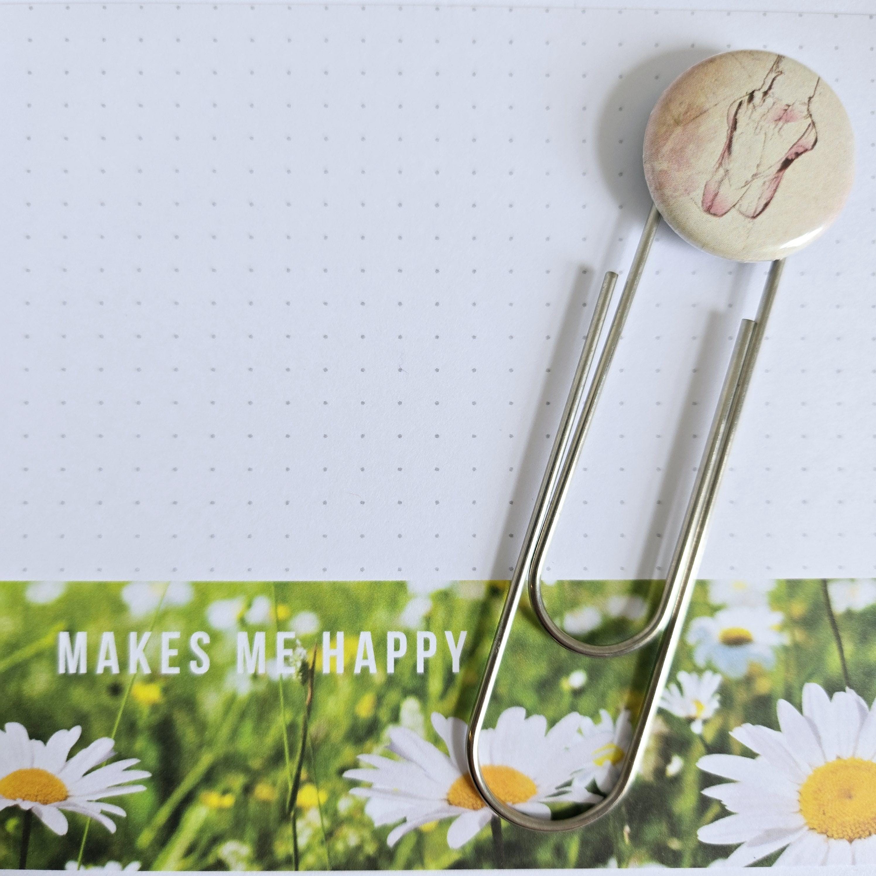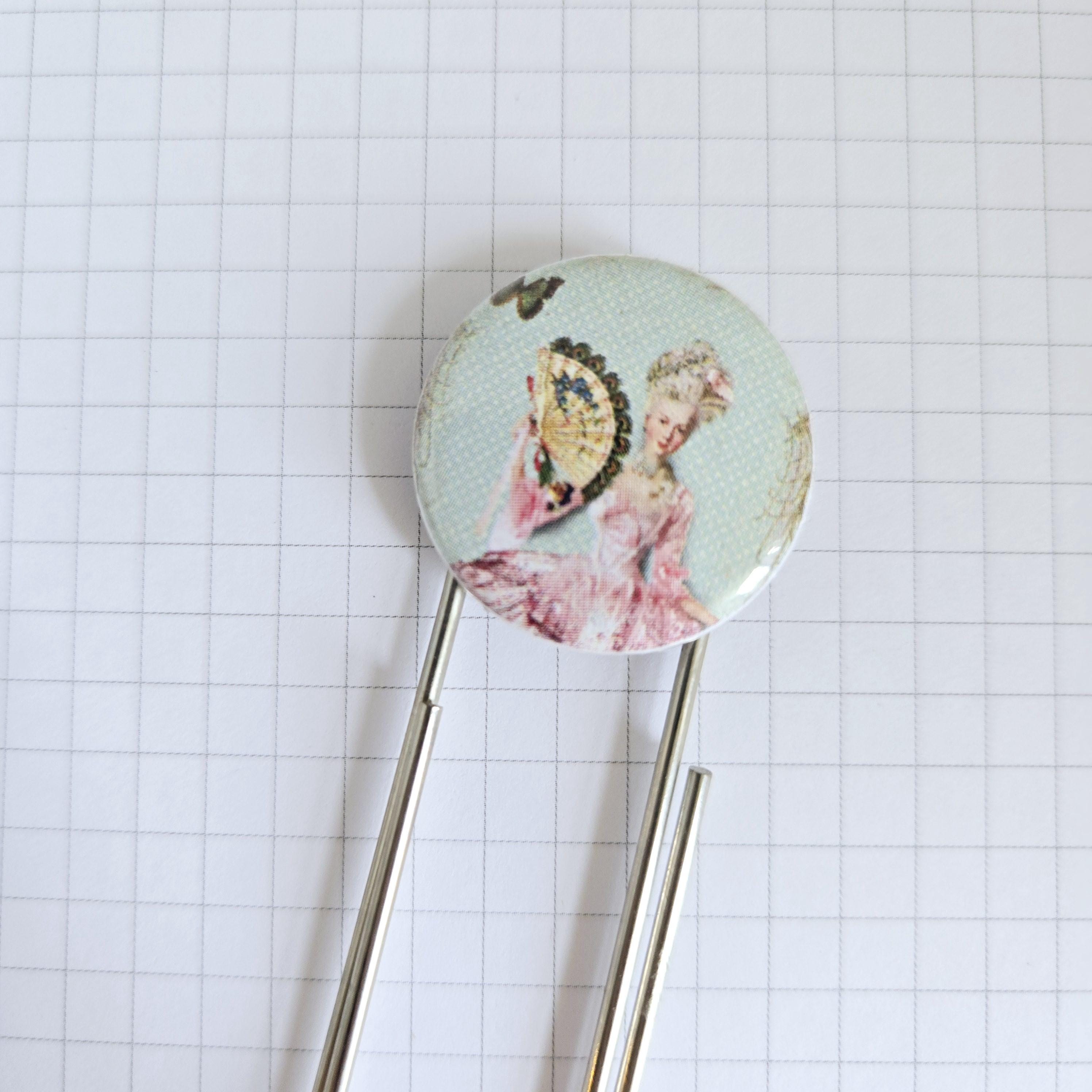 Jumbo metal paper clip bookmark, featuring a one inch metal & paper round decoration covered in mylar plastic.