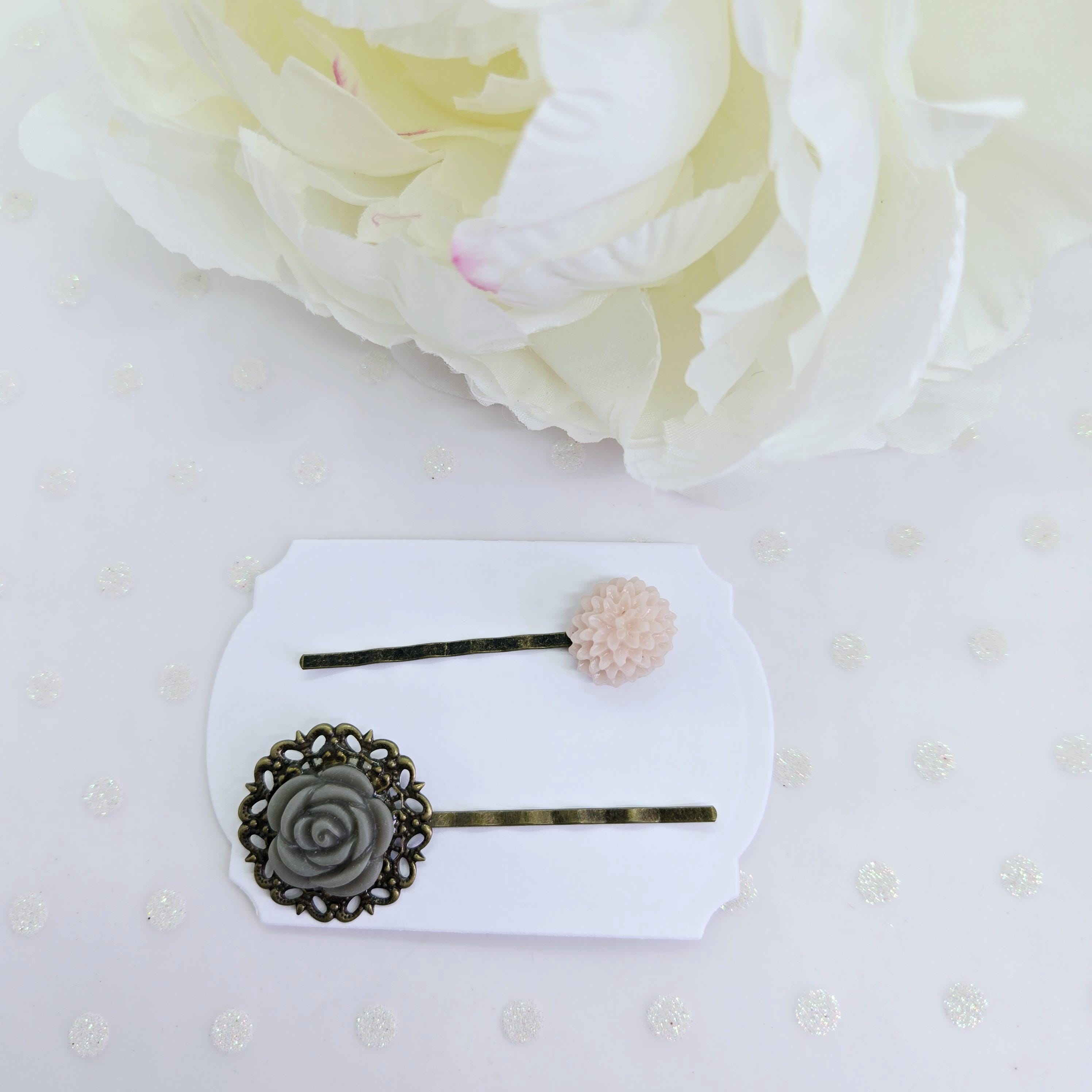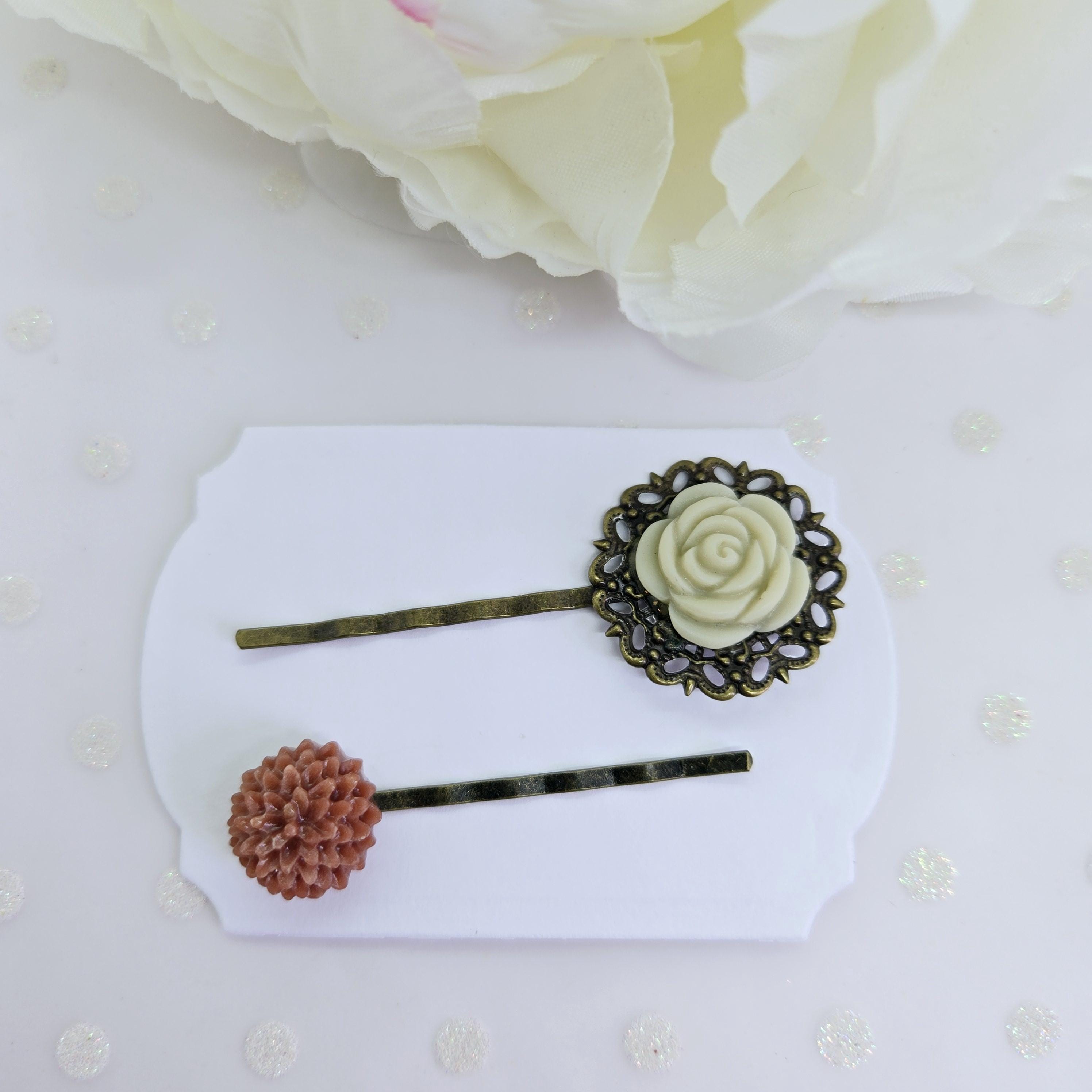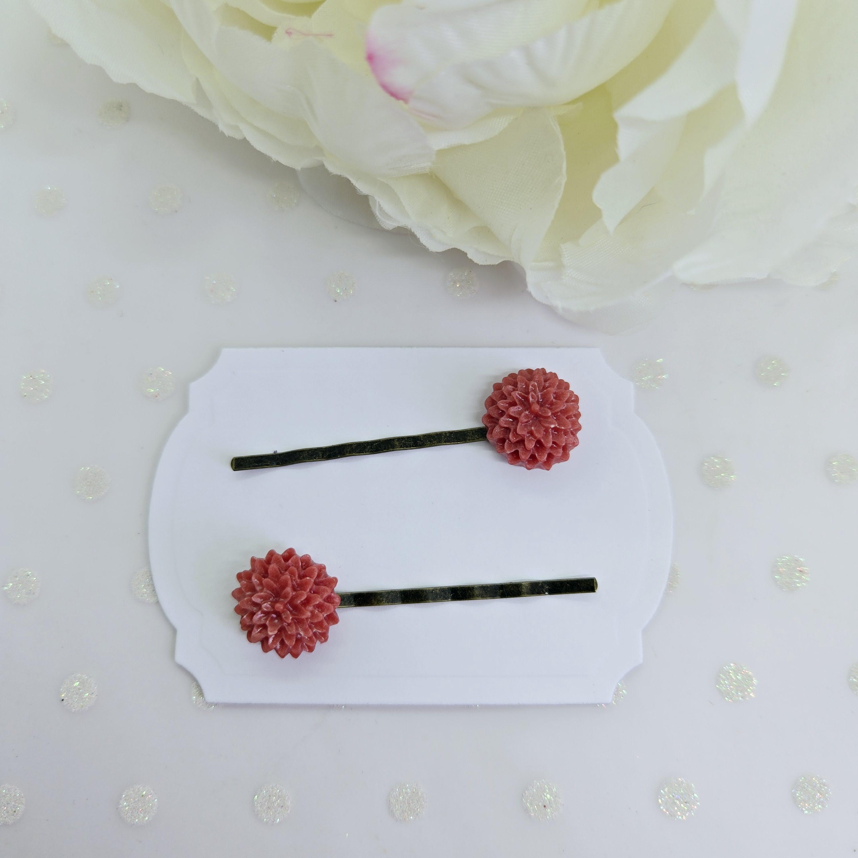 Plastic resin flowers on bronze metal bobby pins. Pick your faves from the drop down menu.