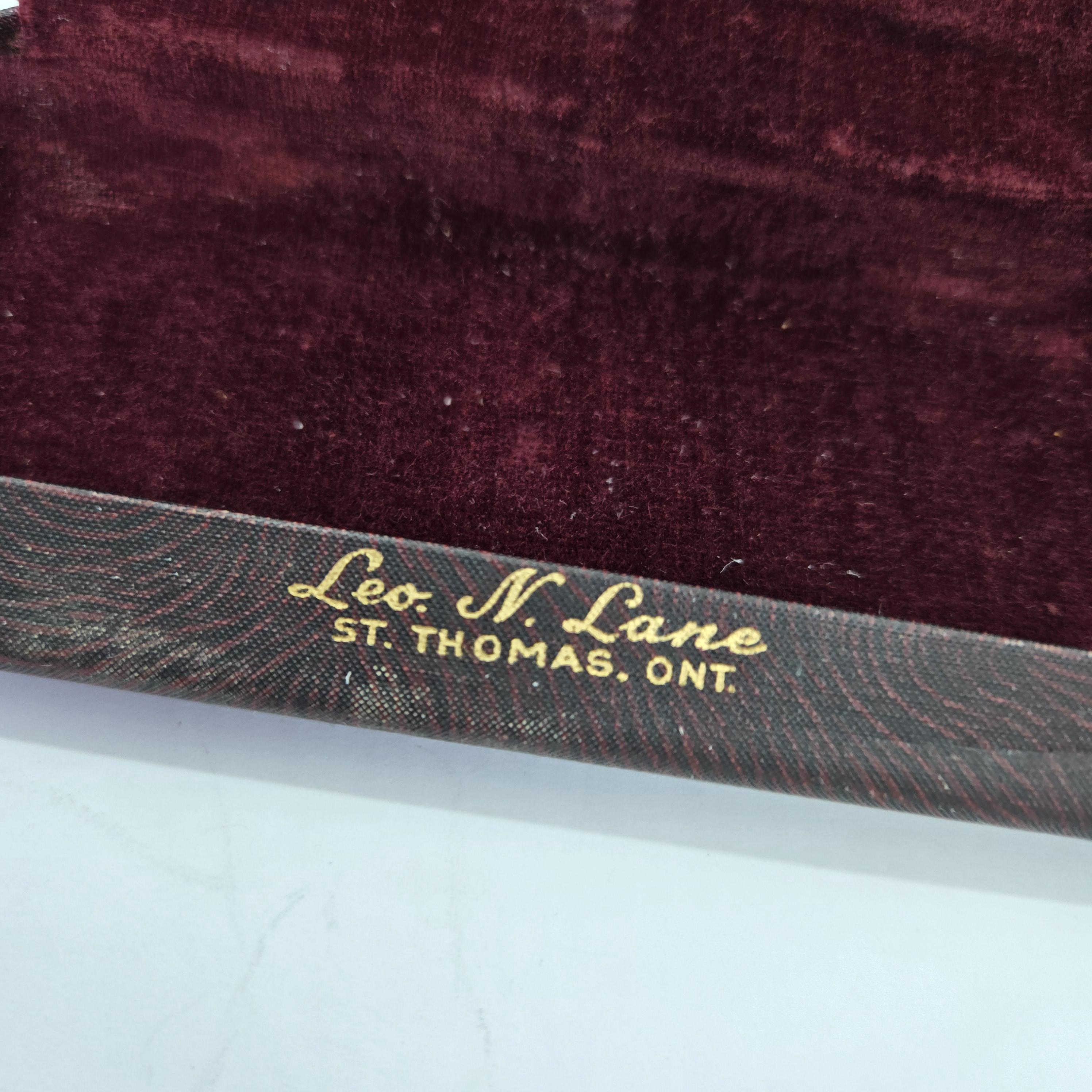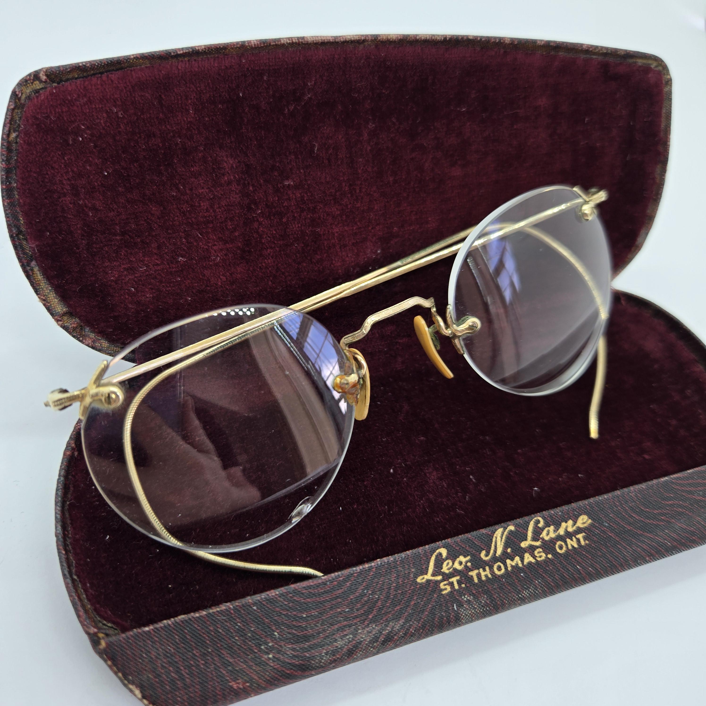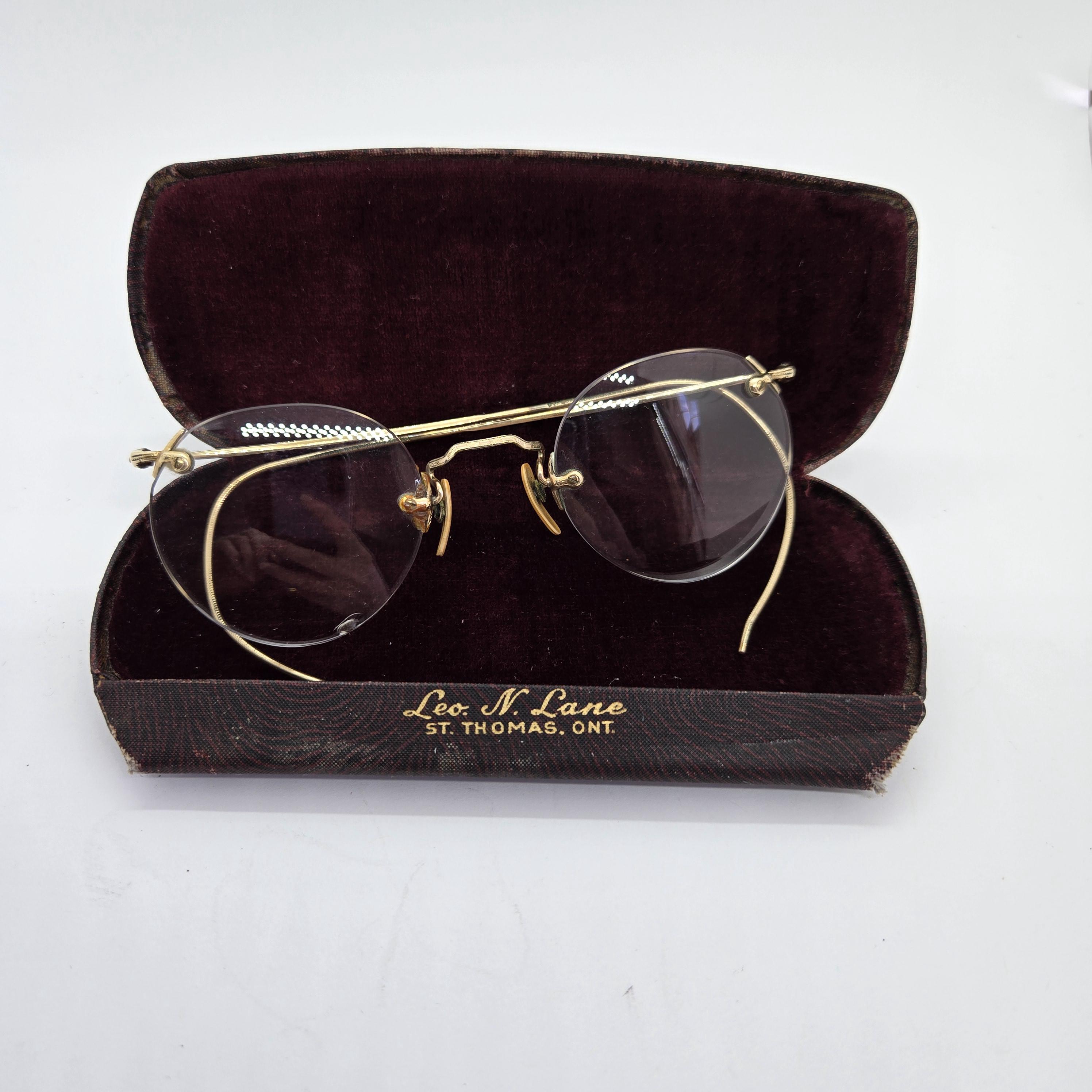 Vintage wire rimless eye glasses in a dark red case marked Leo N Lane, St Thomas Ontario.