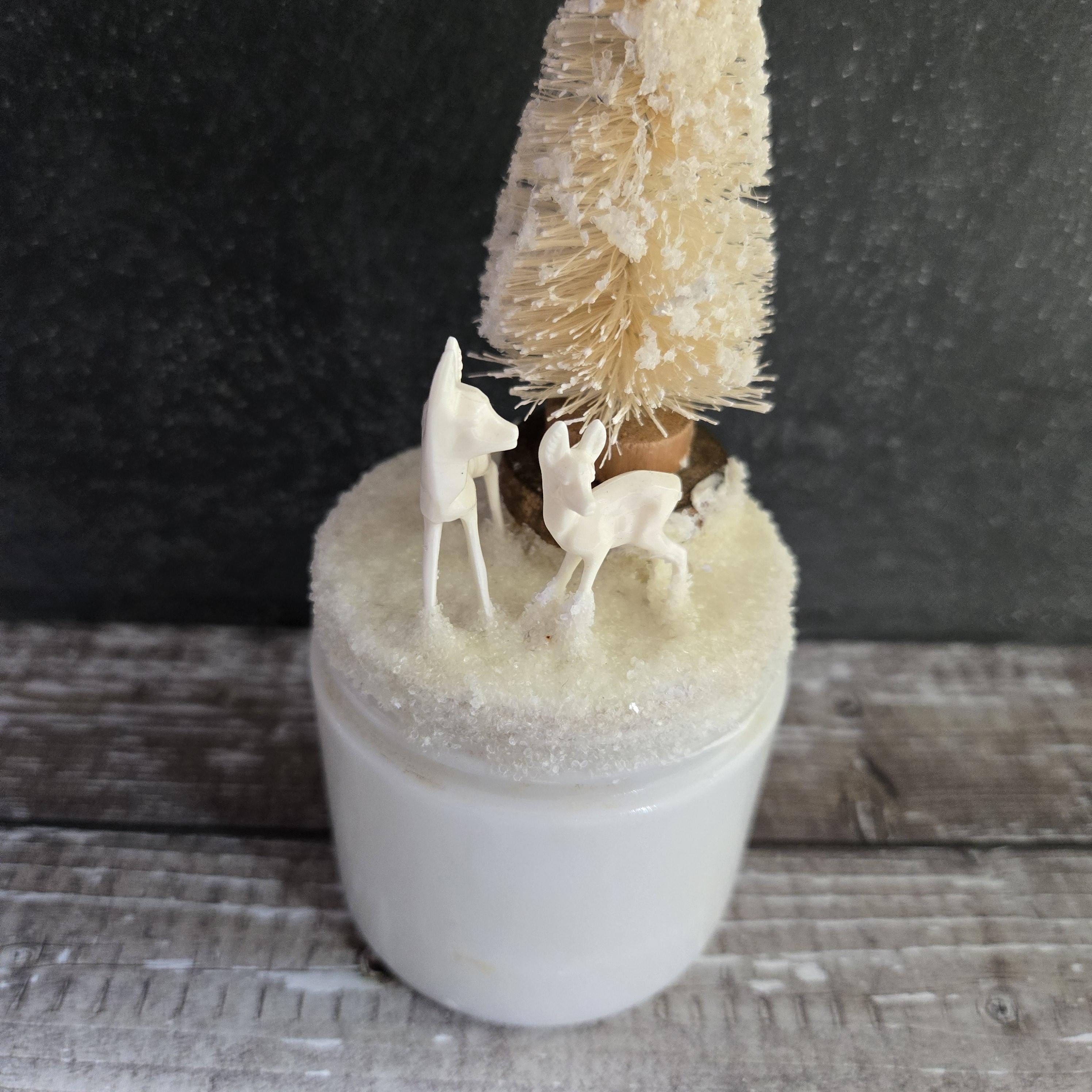 Pretty Christmas vignette nestled into a vintage milk glass cosmetics container. An off white brush trees coated with snowy glitter and complimented by small creamy white plastic deer.