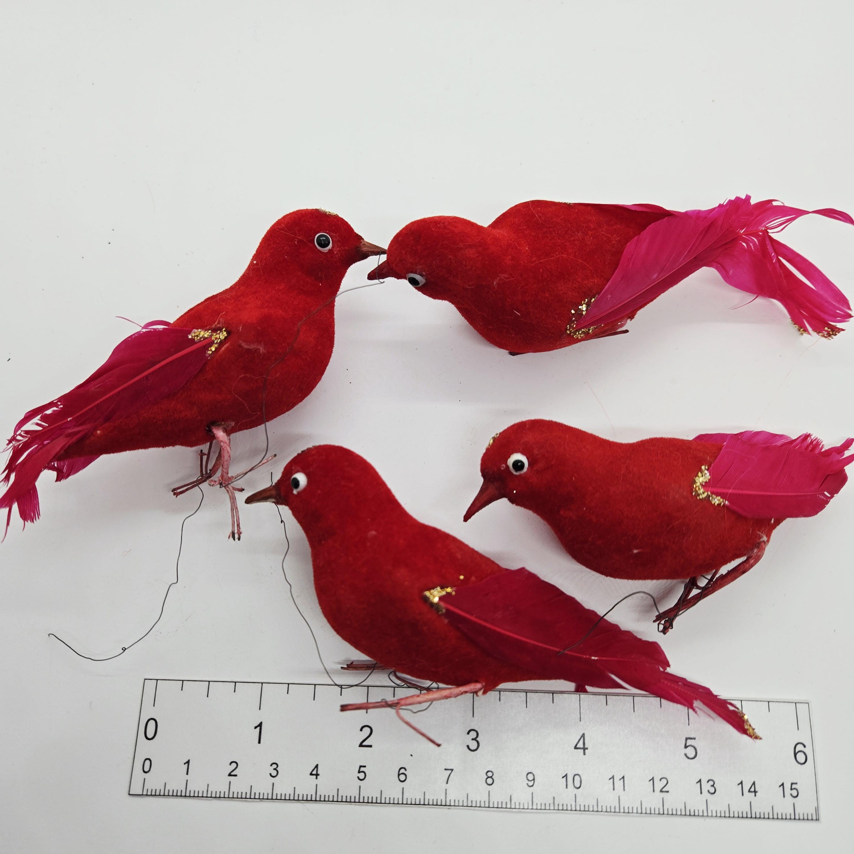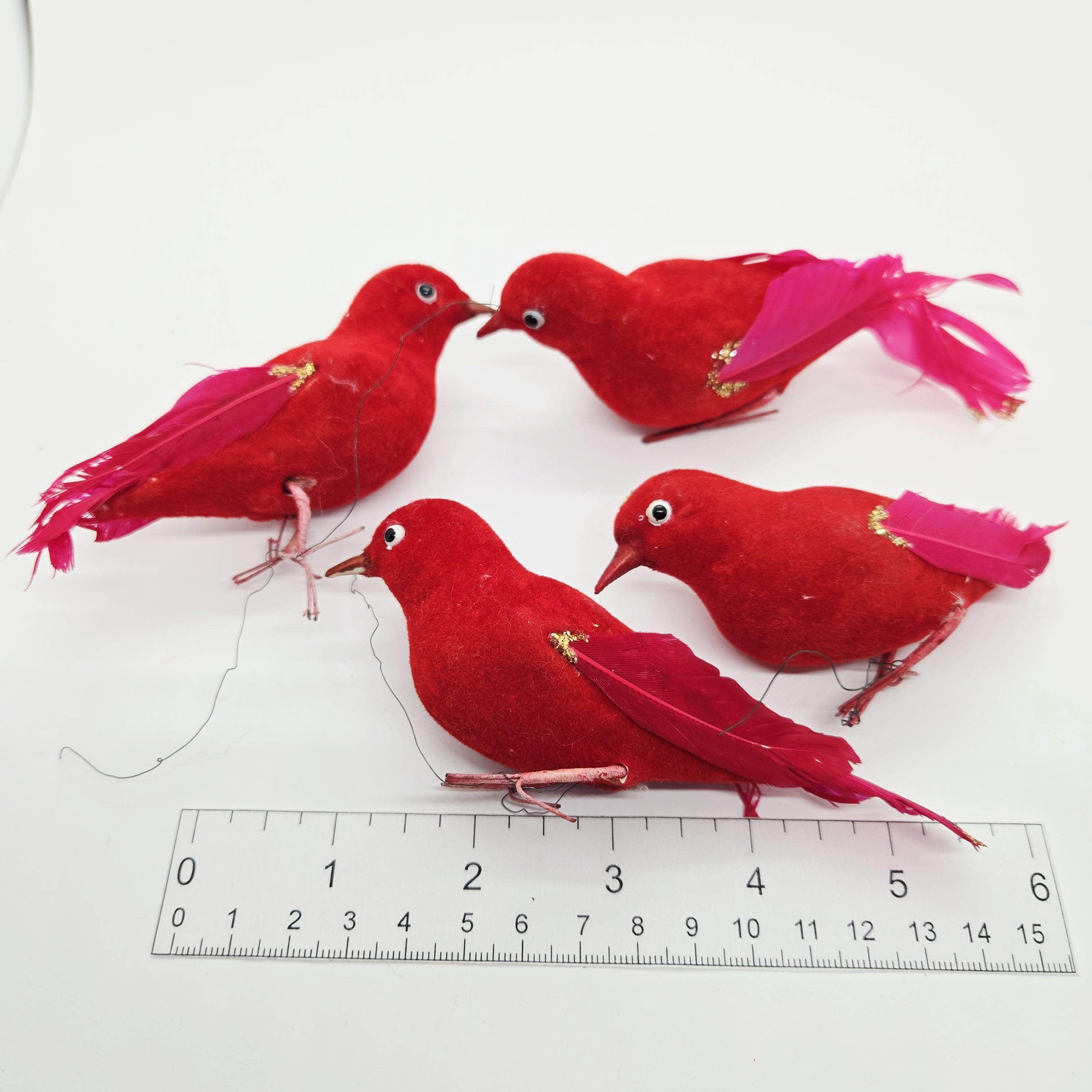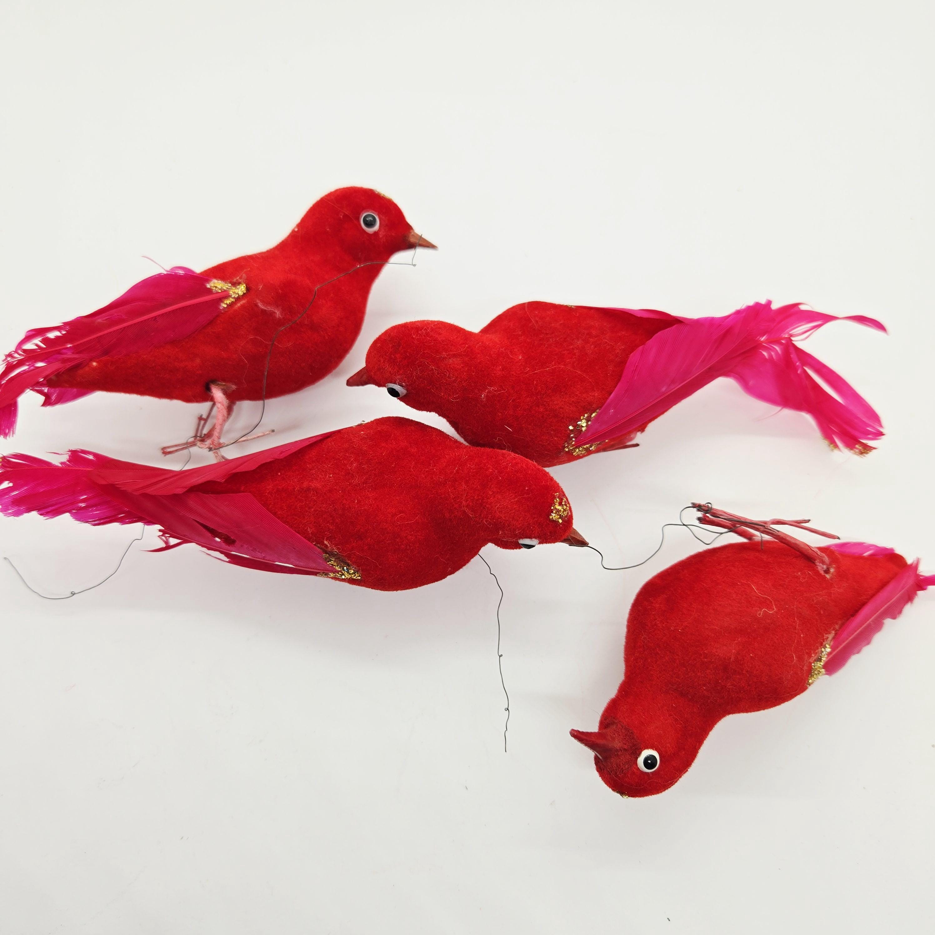 4 vintage red flocked birds with gold glitter, these are old stock and the tails are a bit tattered and might be missing some feathers.