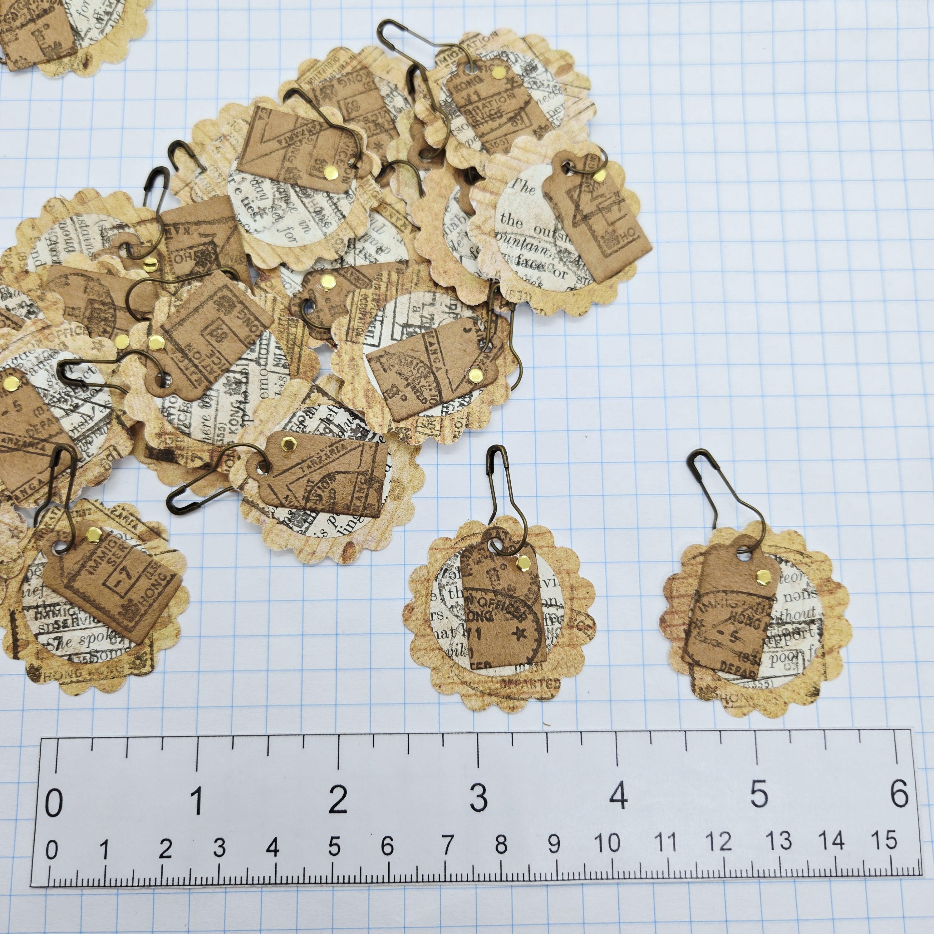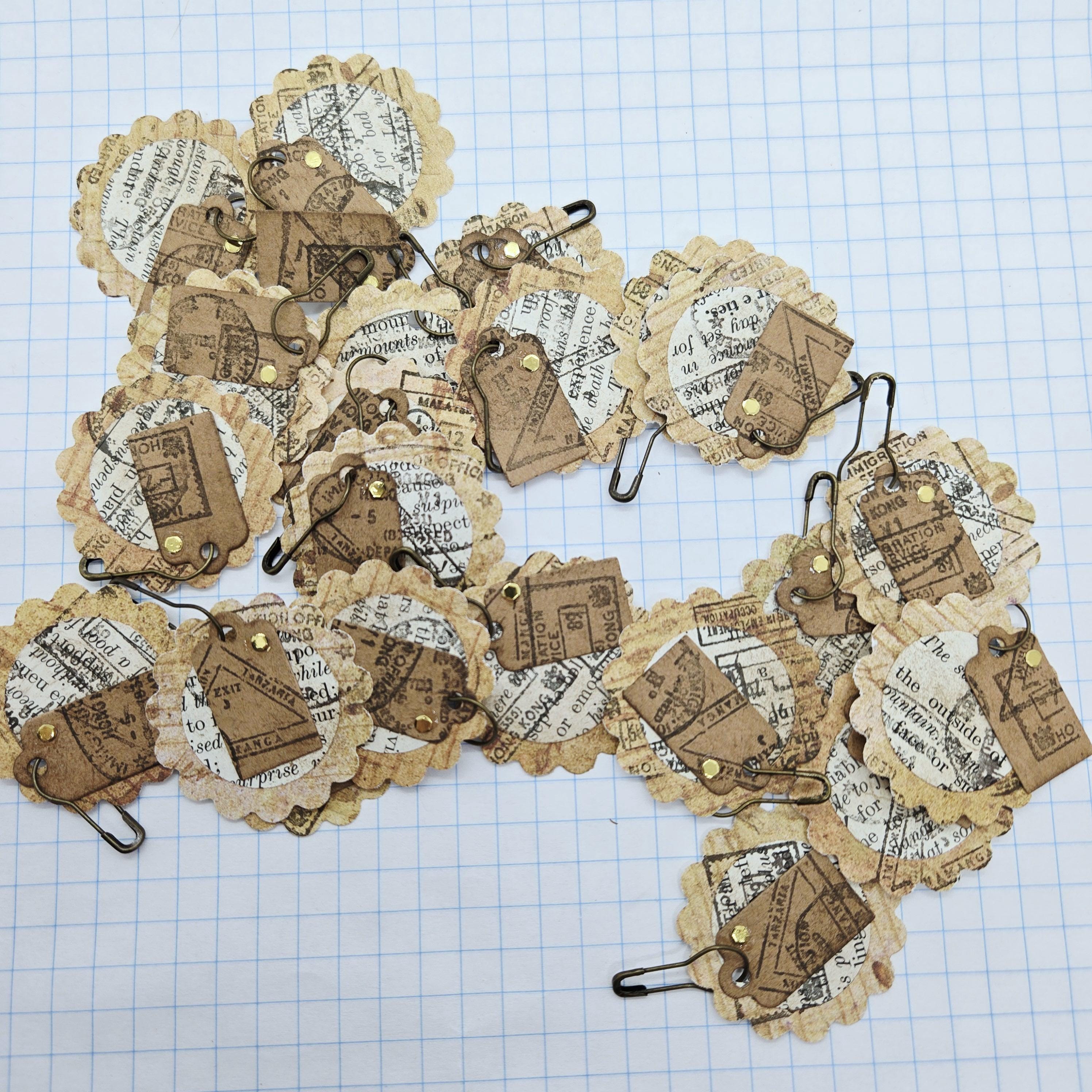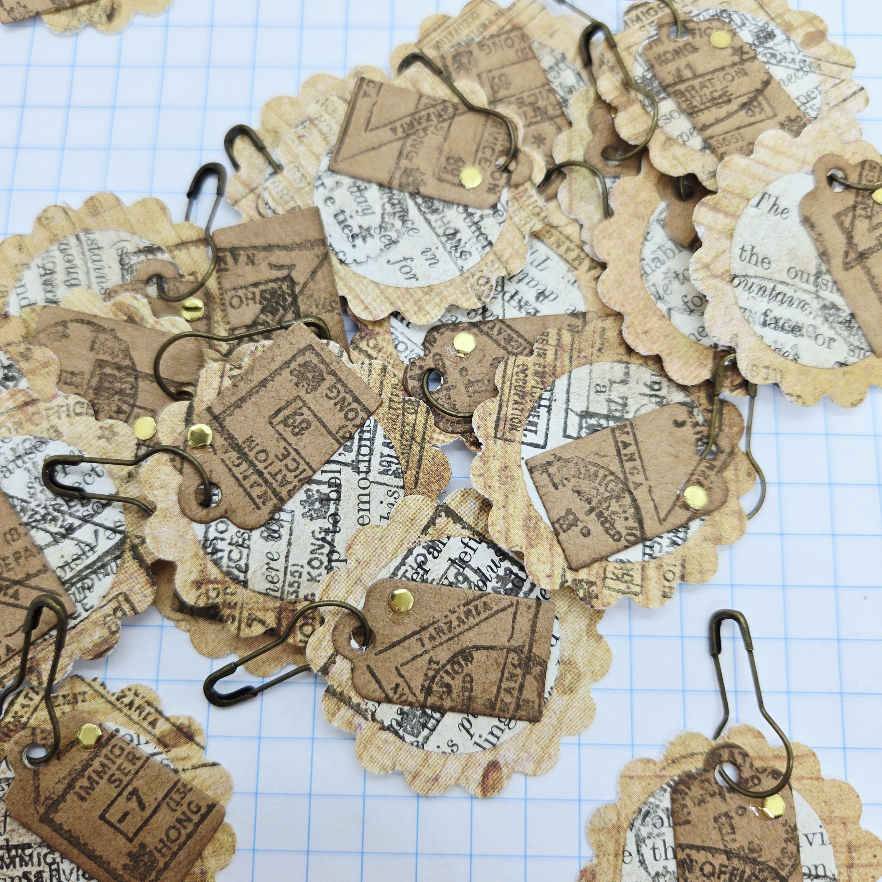 5 random junk journal dangles made from patterned paper, vintage book pages, tags and metal gourd safety pins. Aged and stamped with travel themed passport style stamps.