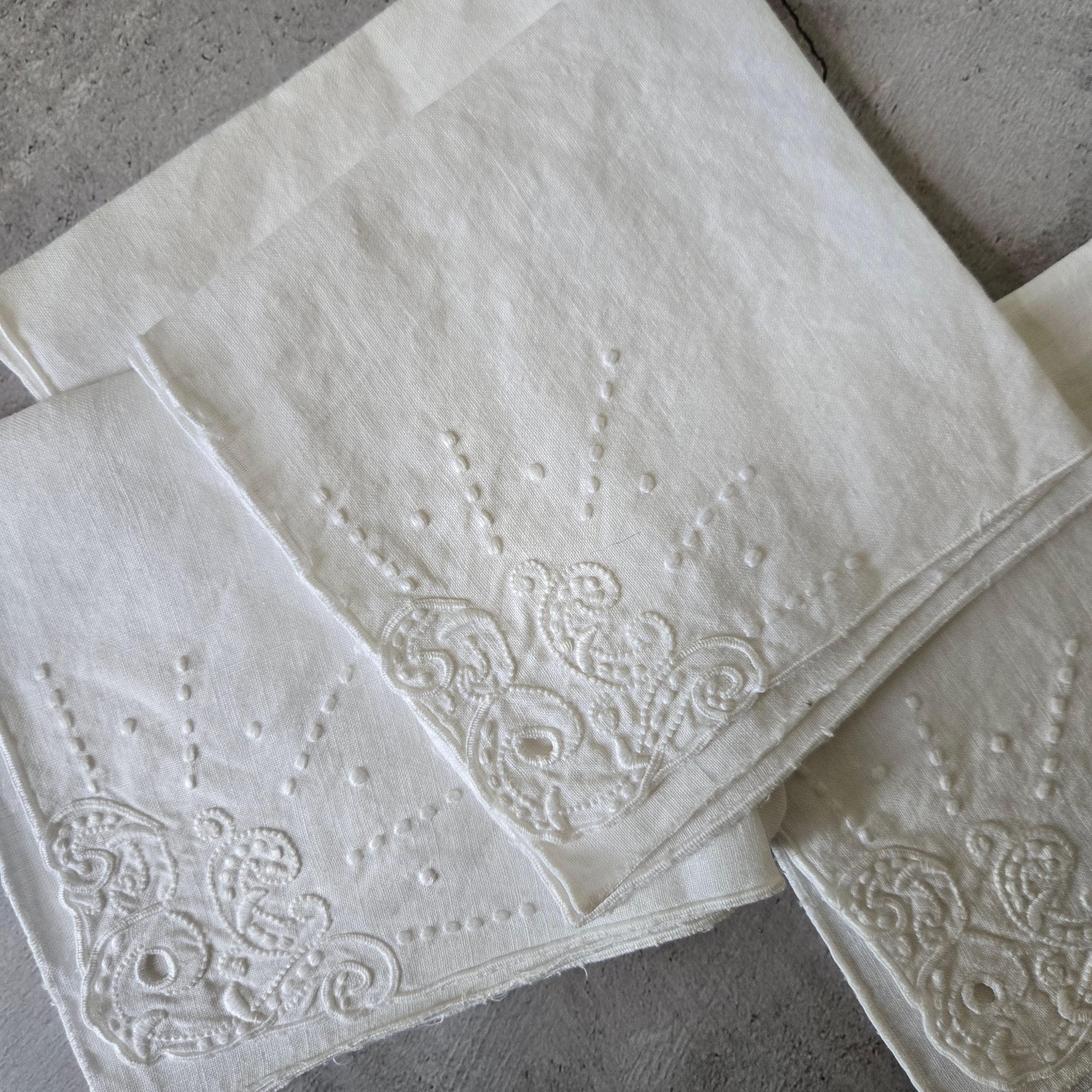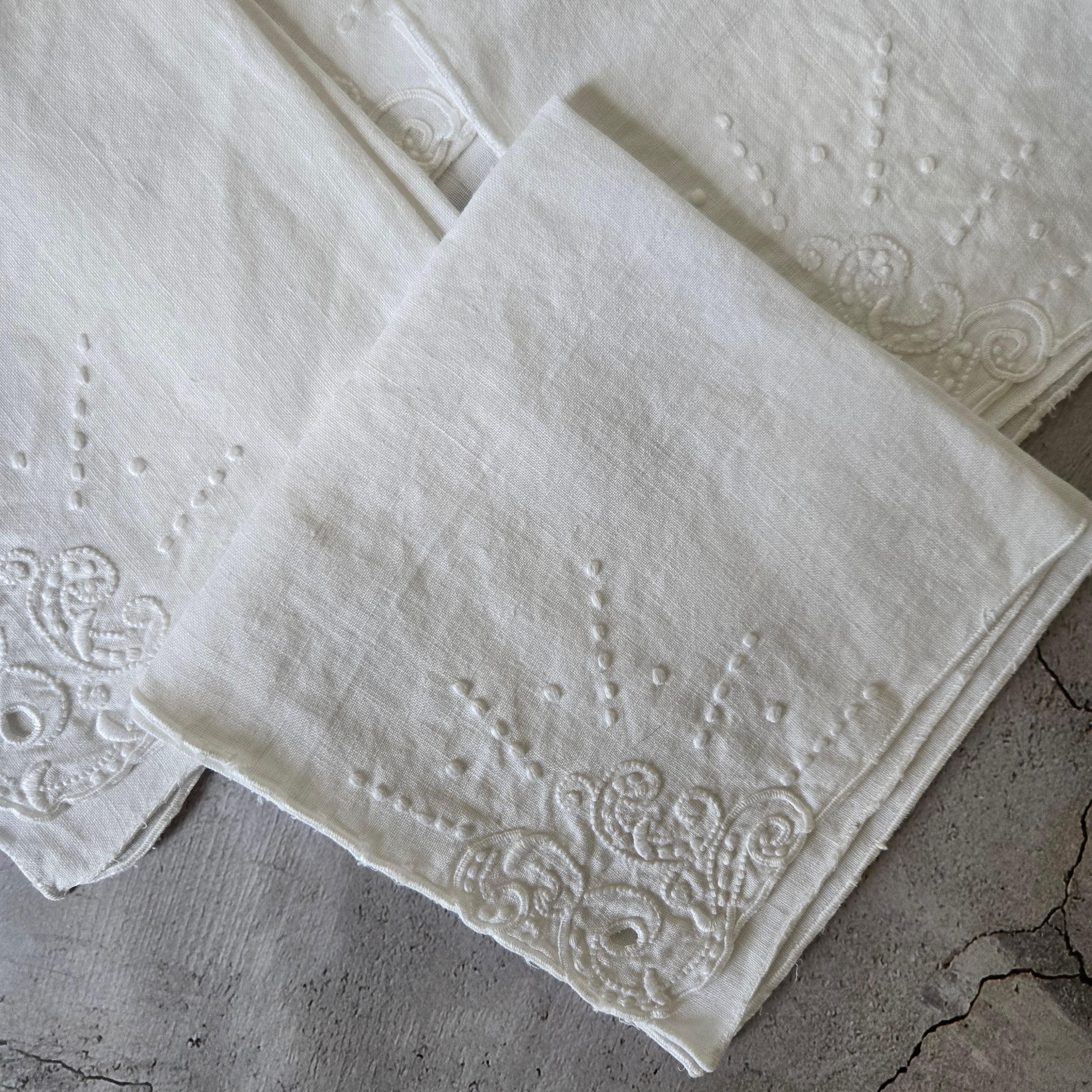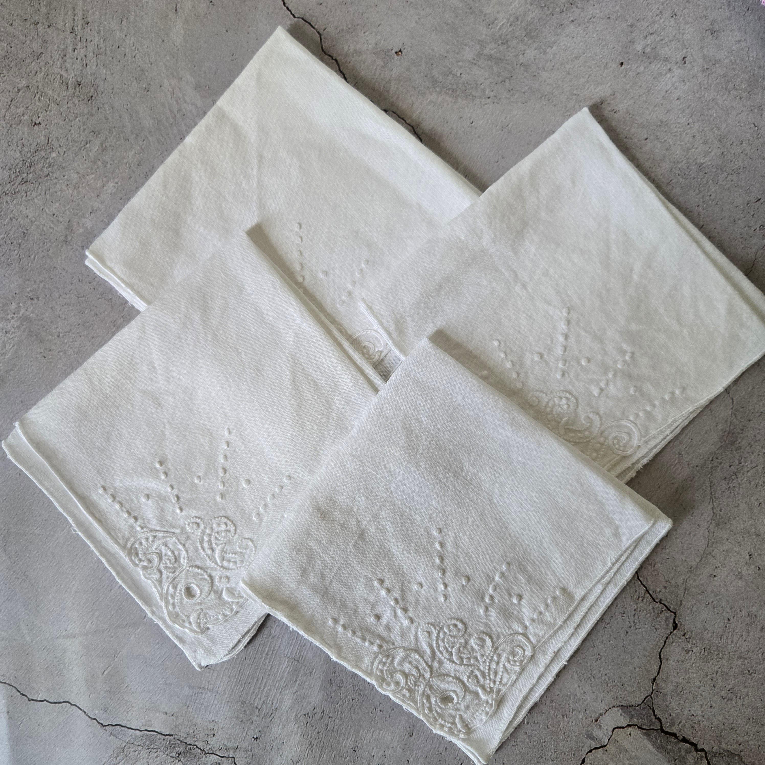 4 Gorgeous handmade linen napkins, generously sized at 10 inches across with embroidery in the corner.