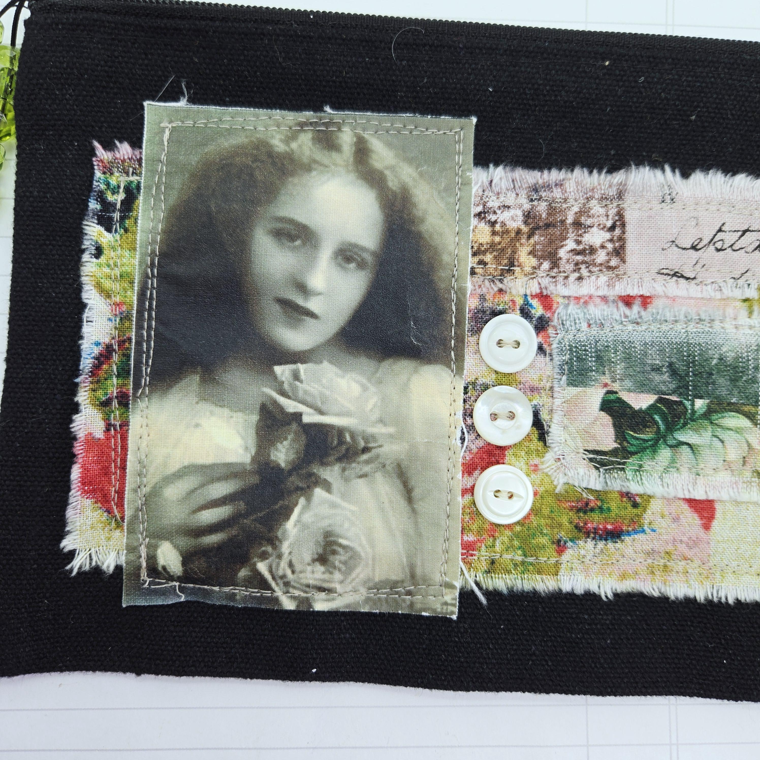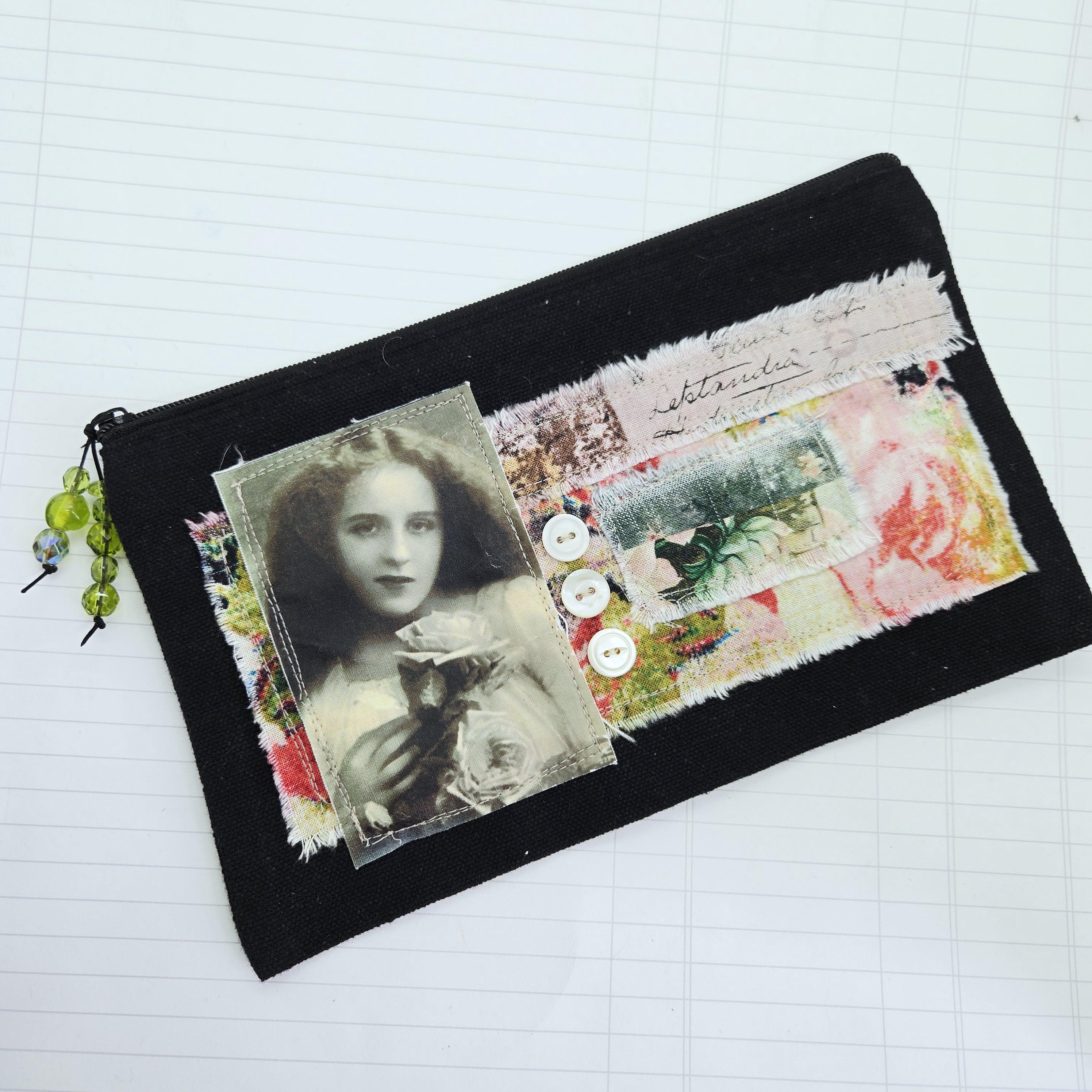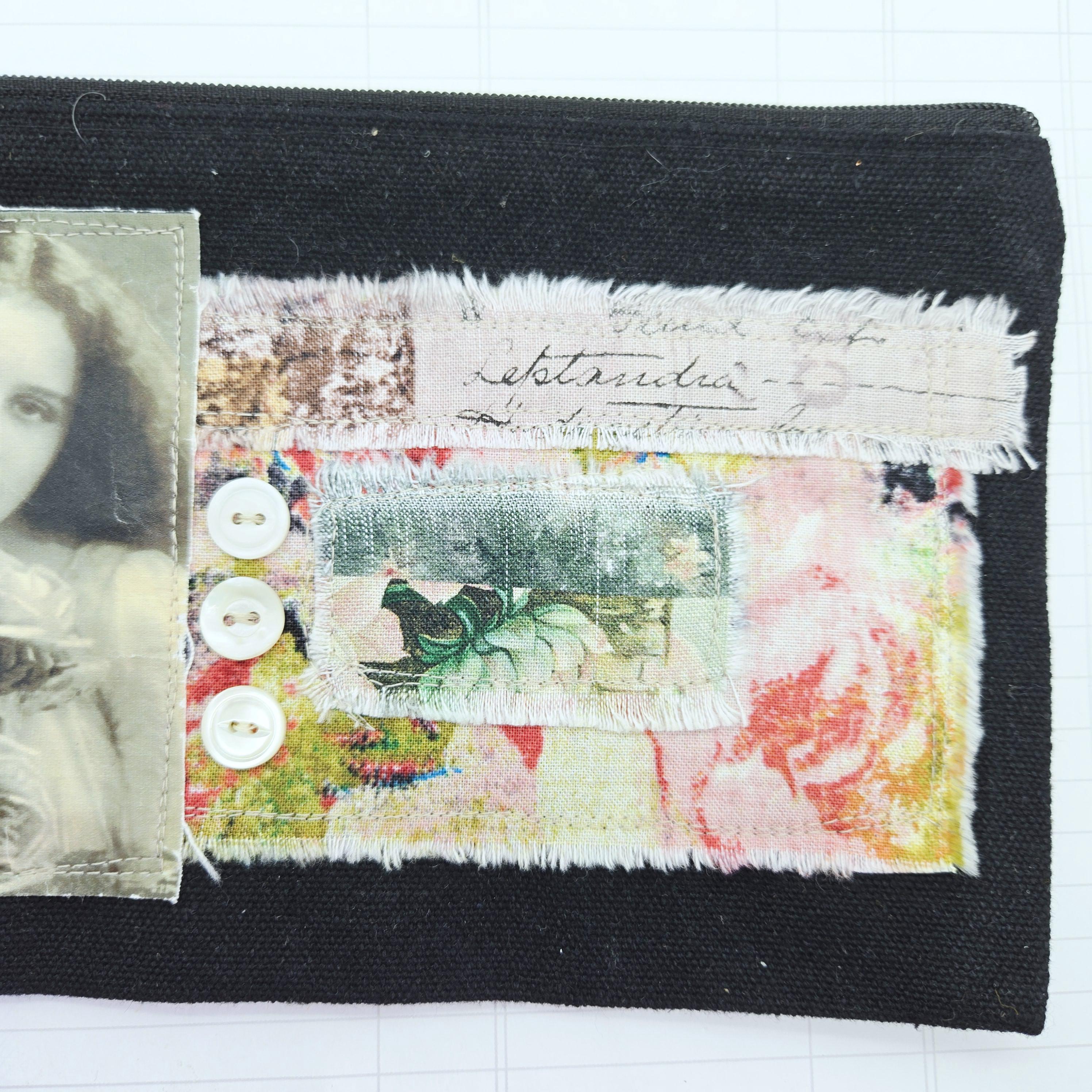 Layers of cotton fabric, transfer image and vintage shell buttons are sewn to a black canvas zipper pouch.
