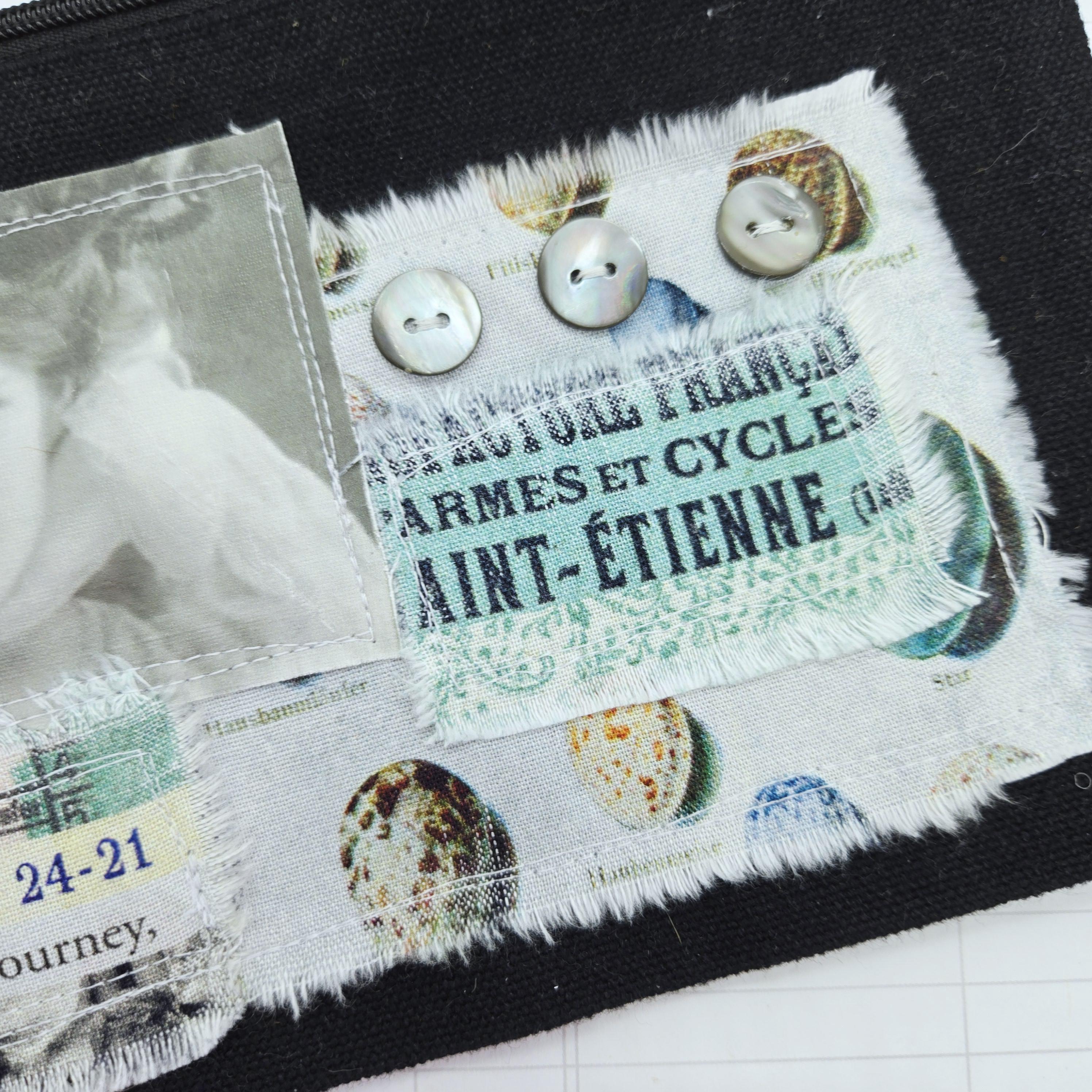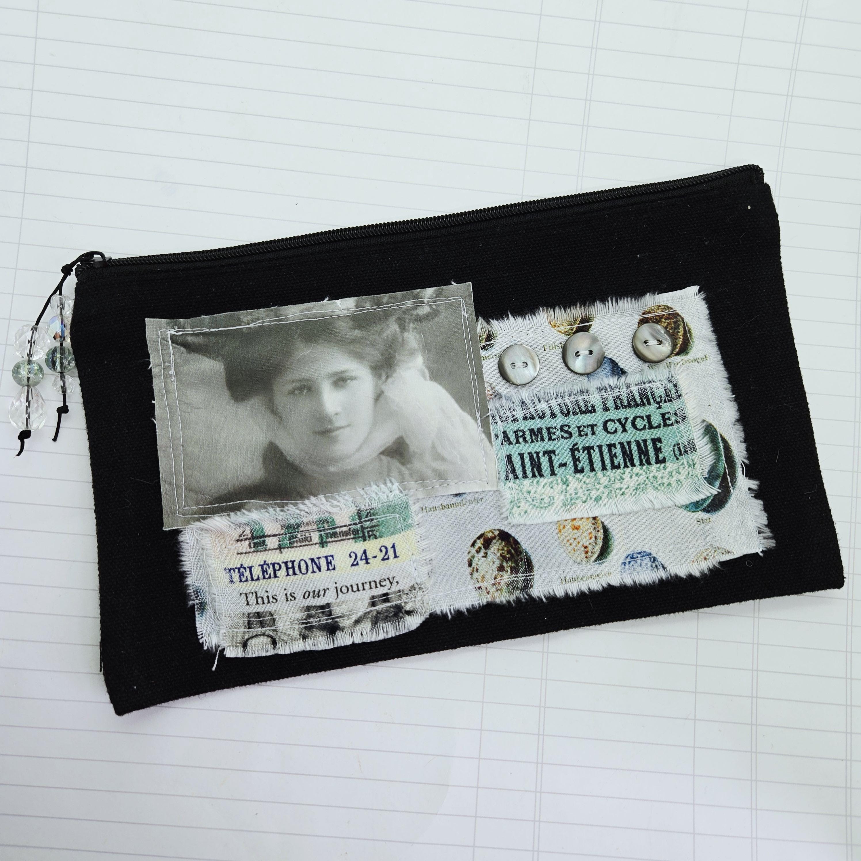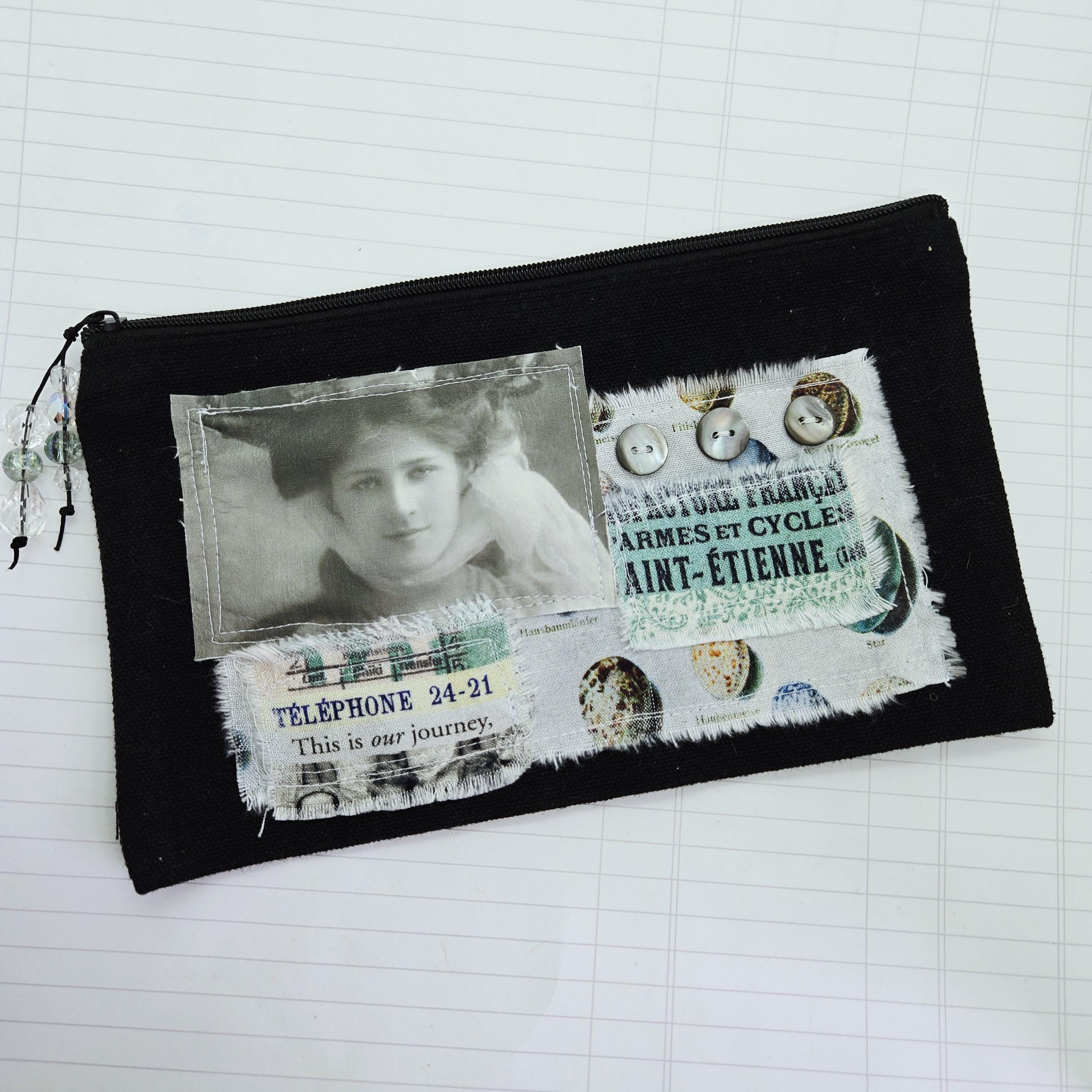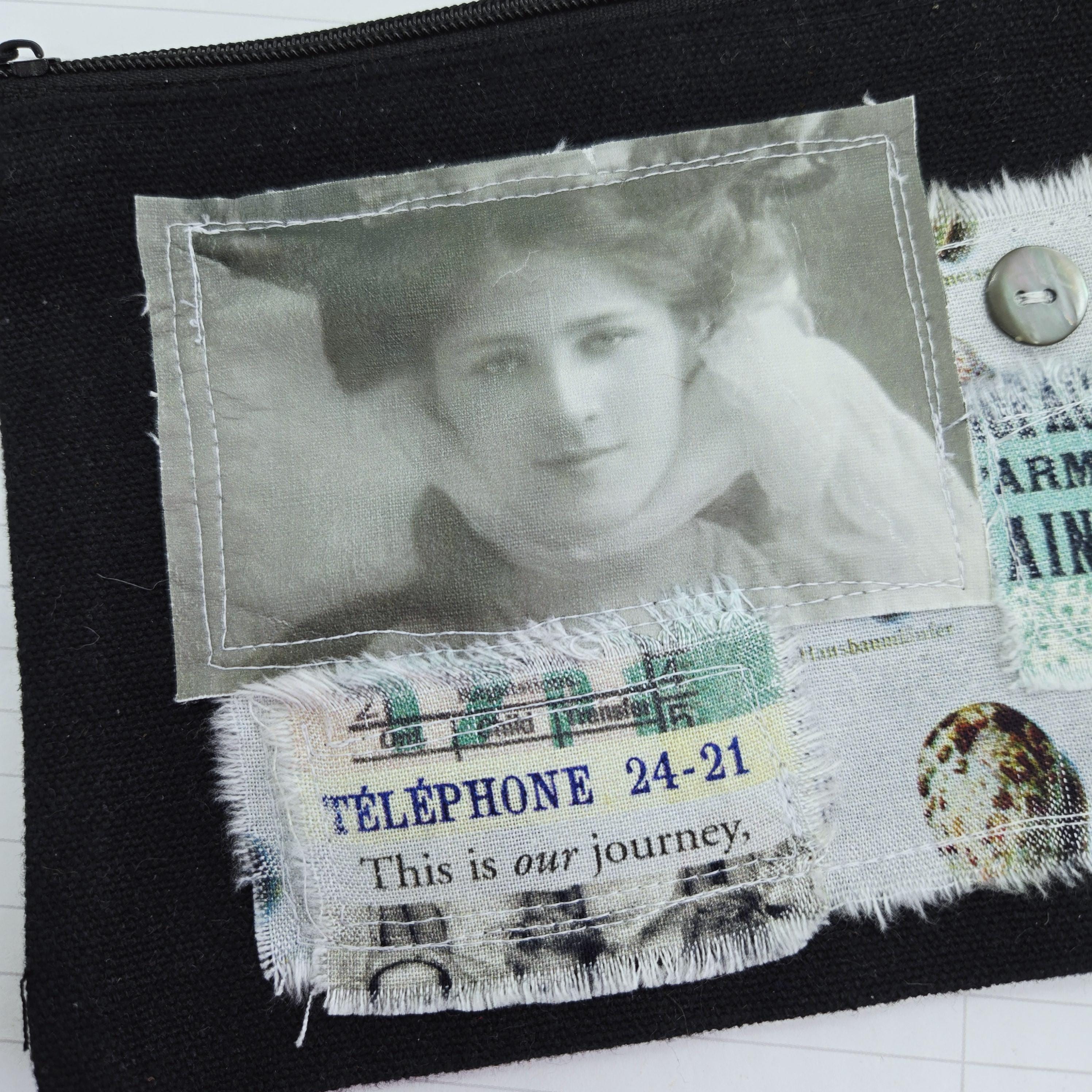 Layers of cotton fabric, transfer image and vintage shell buttons are sewn to a black canvas zipper pouch.
