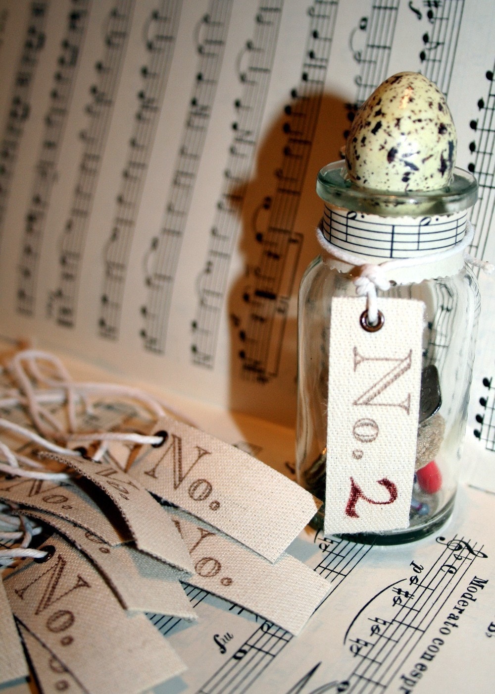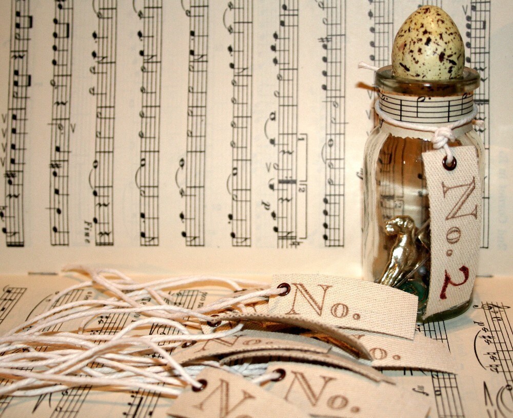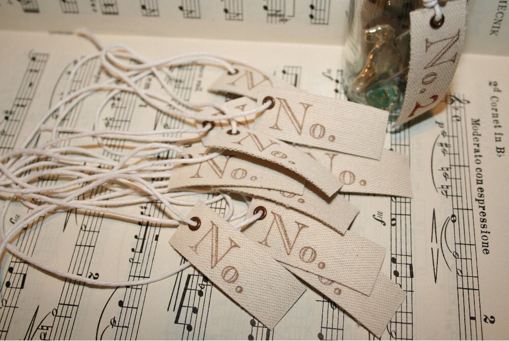 I've taken this simply scrummy vintage heavy fabric 'ribbon' (it's very thick and strong, more like canvas then ribbon) and hand stamped it with a No. stamp in dark brown ink, added a bronze colored eyelet in one corner and a long piece of white butchers twine. I leave the twine loose so you can use your own style of knot to tie it...