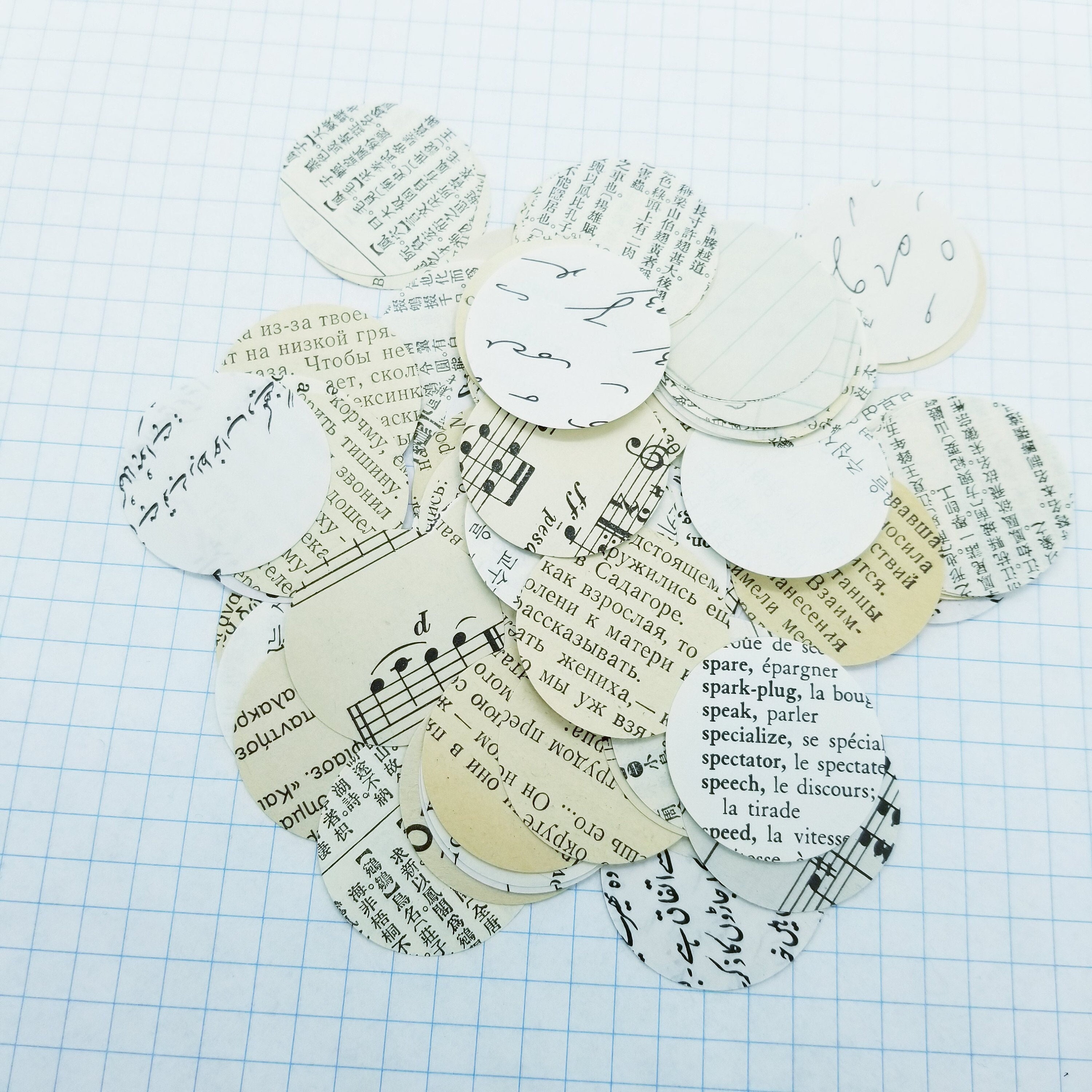 100 punched out pages from music books, language books, dictionary pages and more.