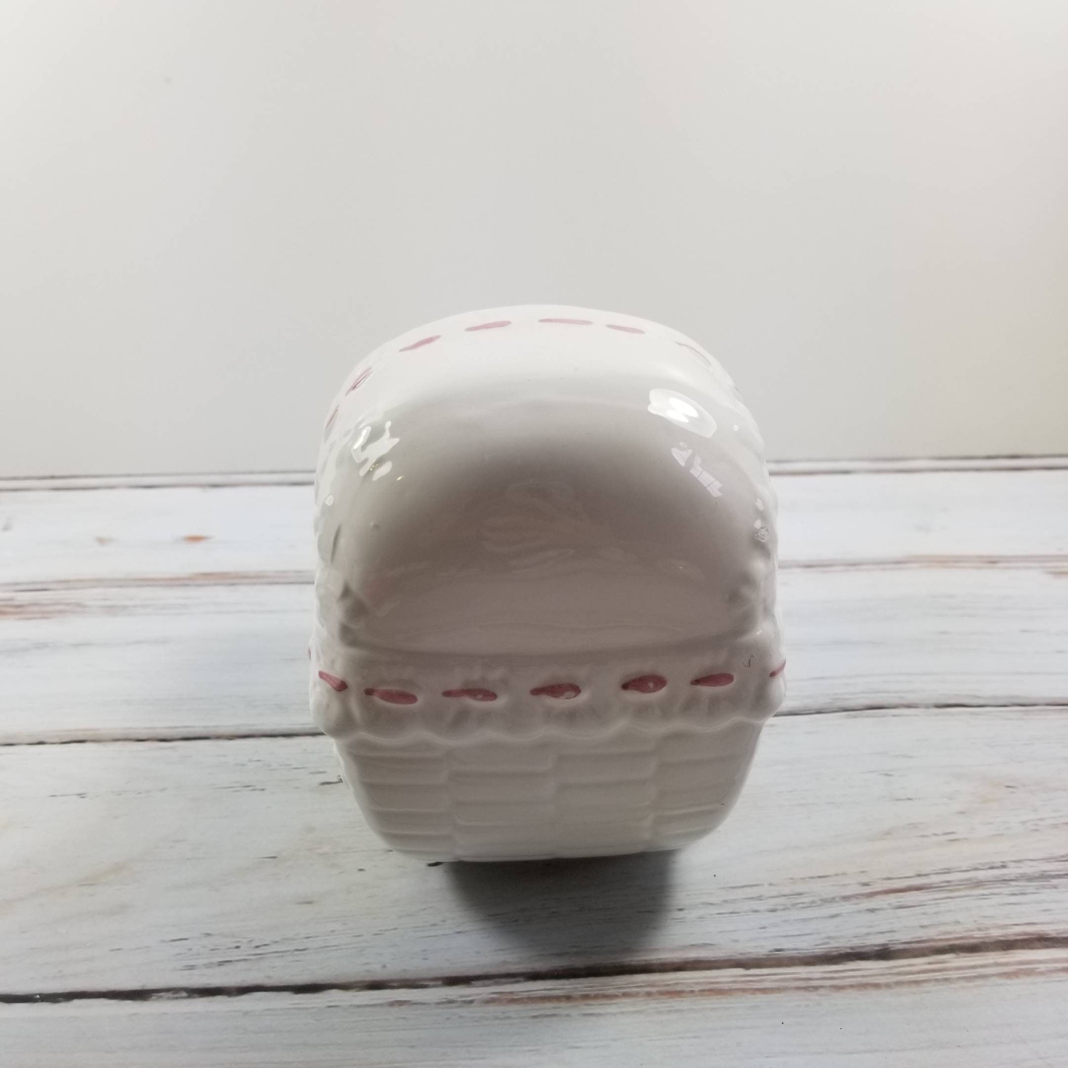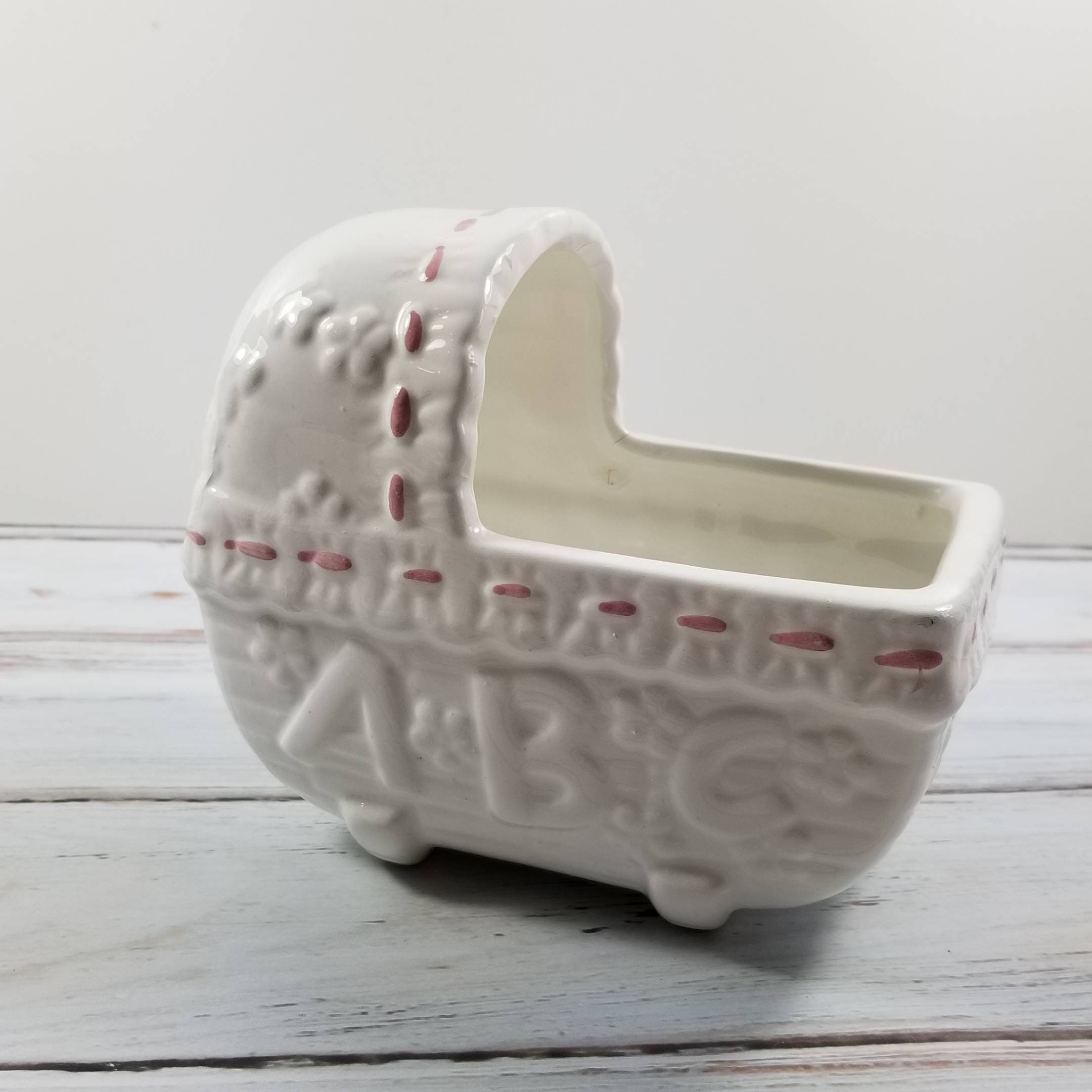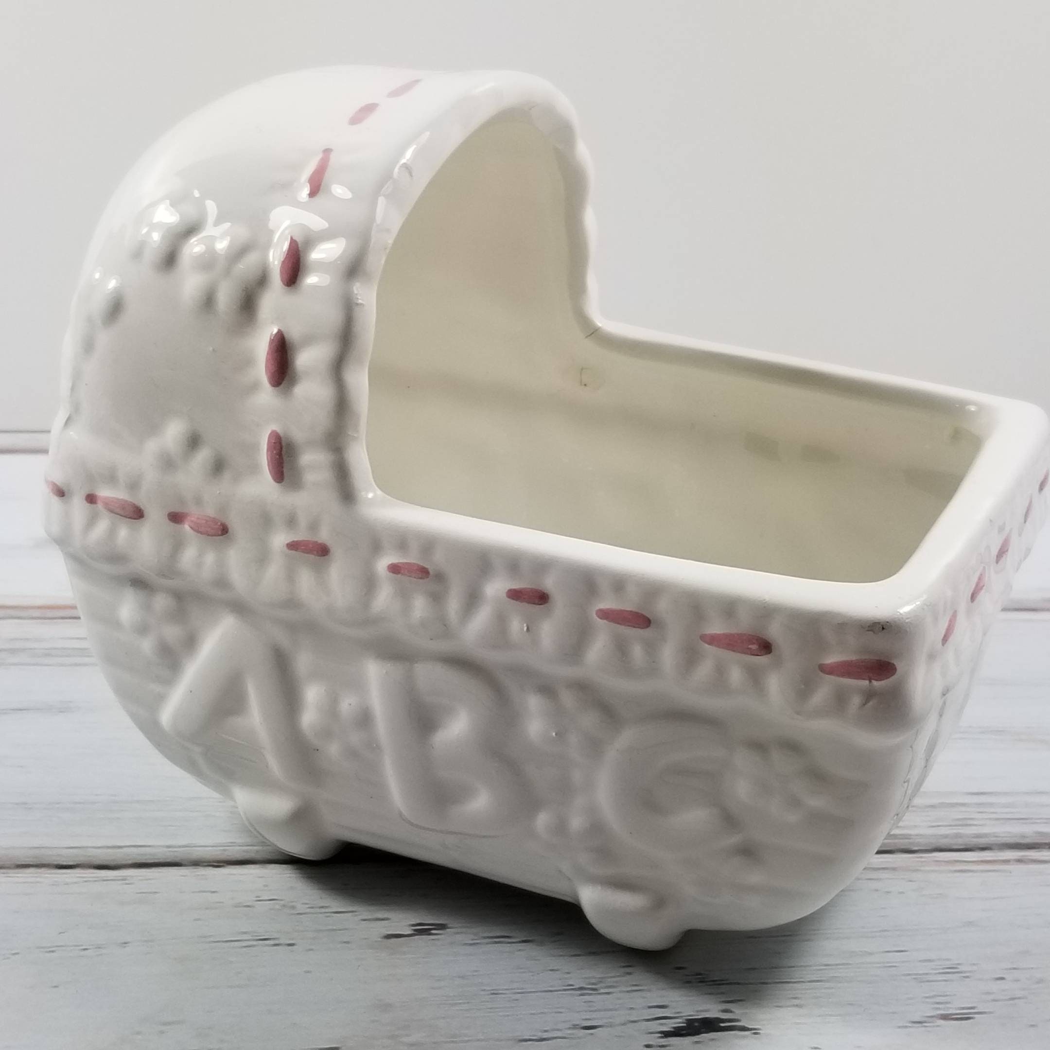 Vintage white and pink pottery baby nursery pink crib planter. Would look lovely with a plant or for storing just about anything.