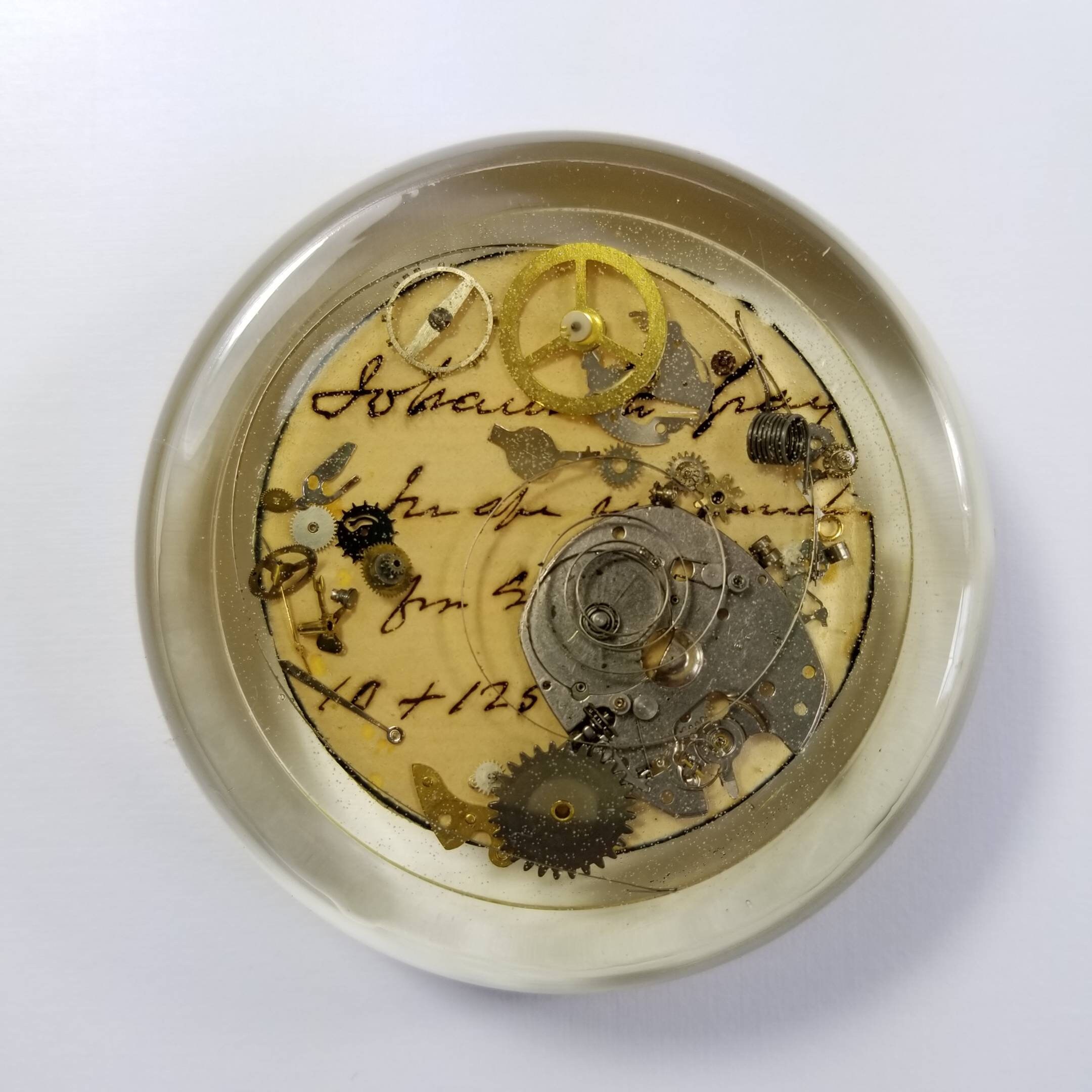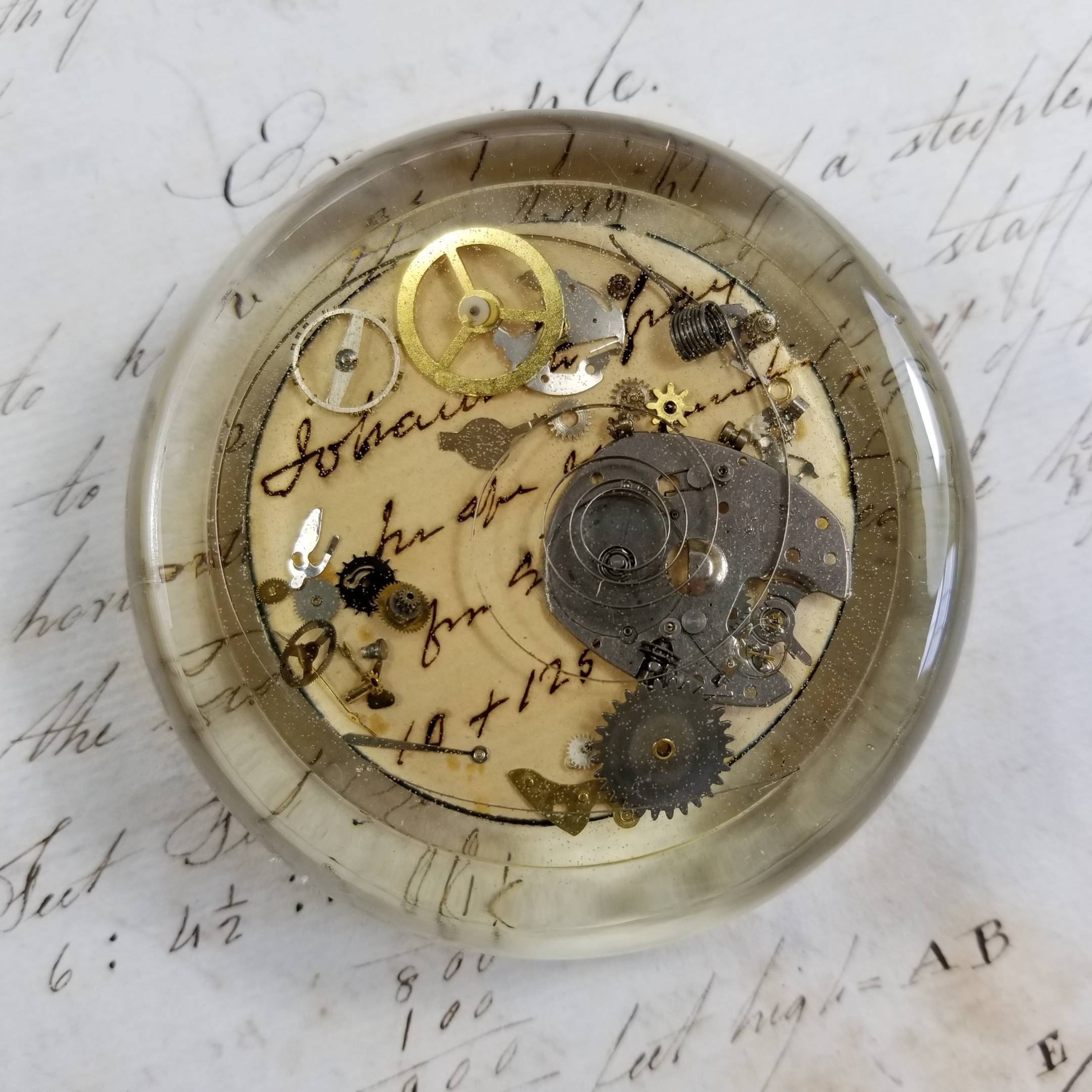 Glass paperweight filled with an assortment of watch & clock gears and springs for a steampunk look, all set against a scrap of paper ephemera.