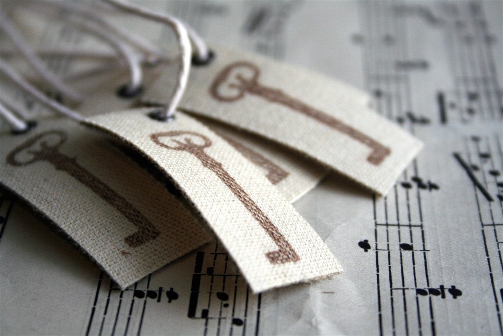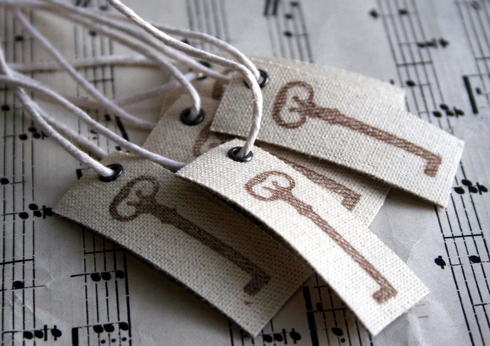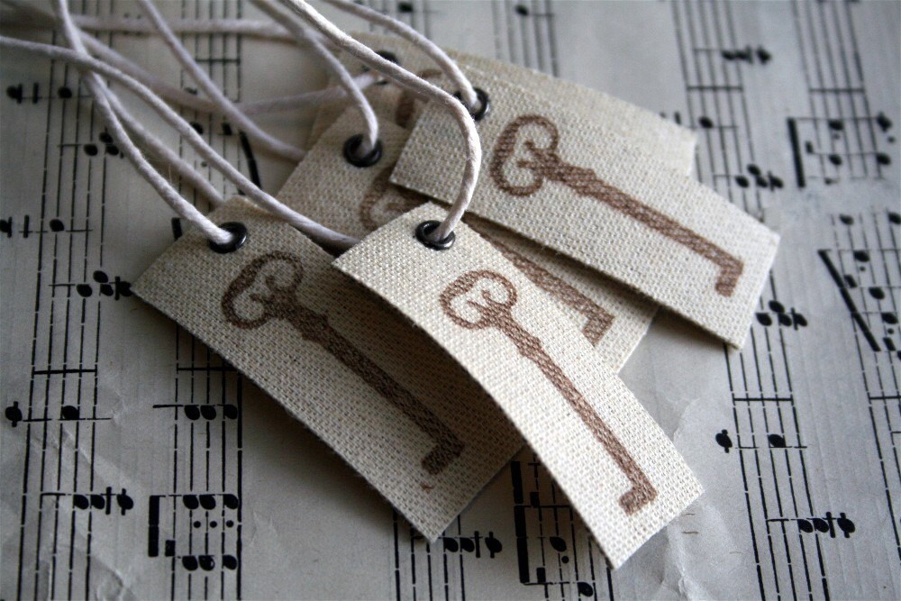 I've taken this simply scrummy vintage heavy fabric 'ribbon' (it's very thick and strong, more like canvas then ribbon) and hand stamped it with a Key in dark brown ink, added an eyelet in one corner and a long piece of white butchers twine. I leave the twine loose so you can use your own style of knot to tie it...