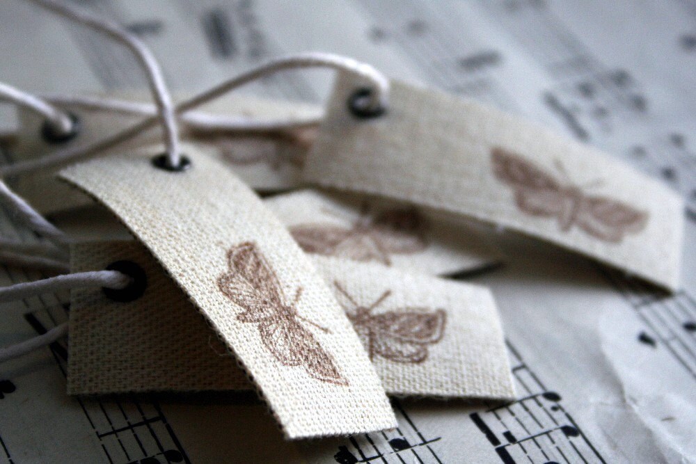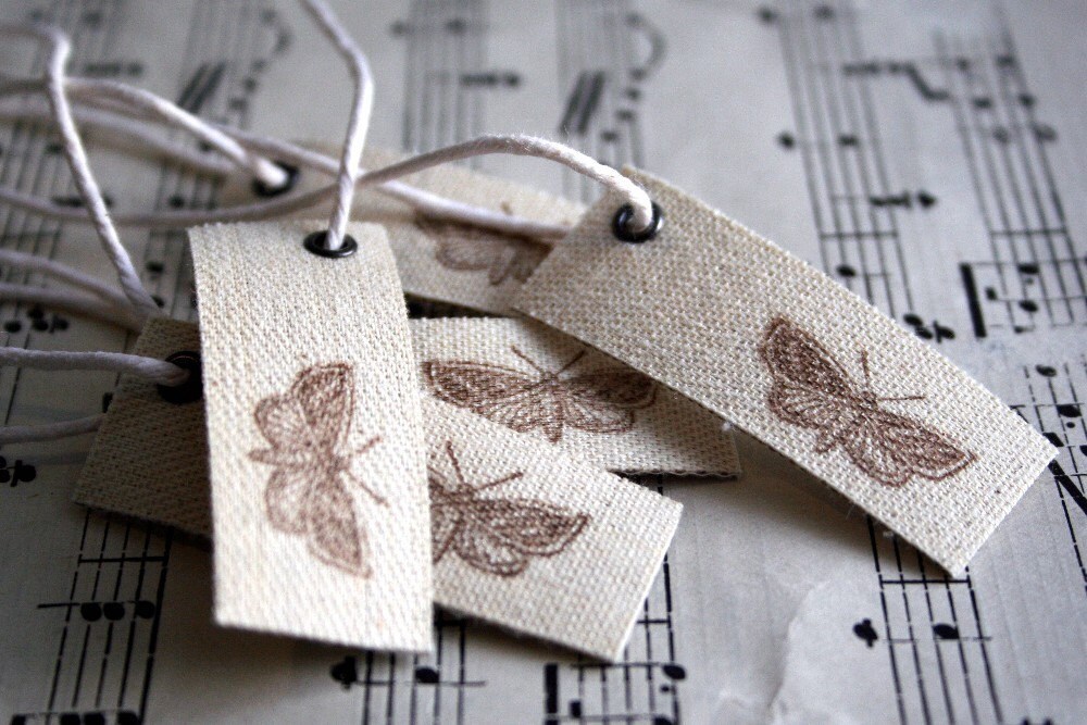 I've taken this simply scrummy vintage heavy fabric 'ribbon' (it's very thick and strong, more like canvas then ribbon) and hand stamped it with a Moth in dark brown ink, added an eyelet in one corner and a long piece of white butchers twine. I leave the twine loose so you can use your own style of knot to tie it...