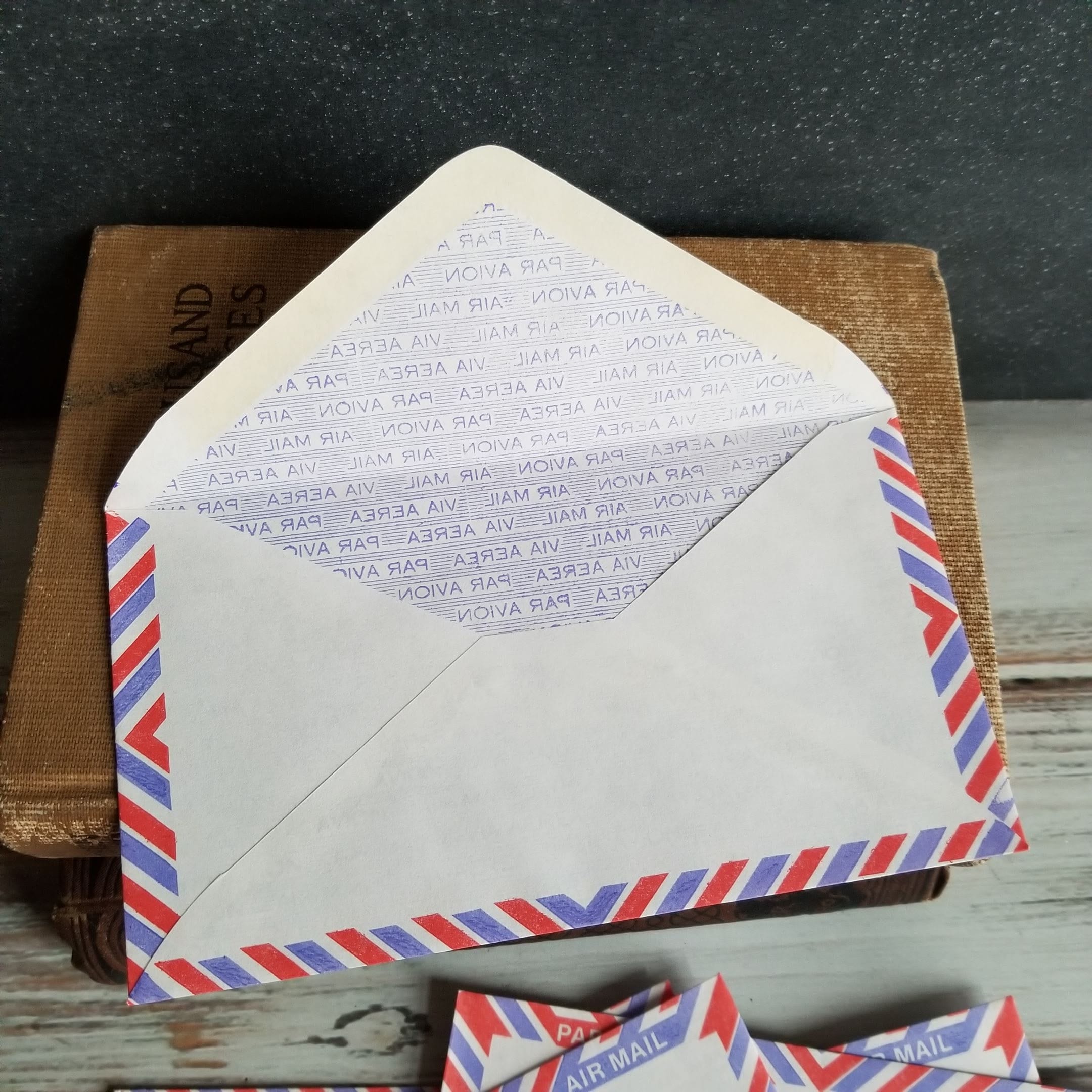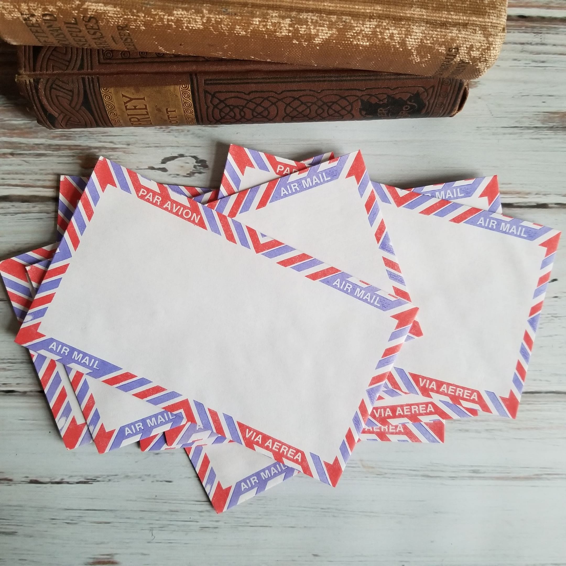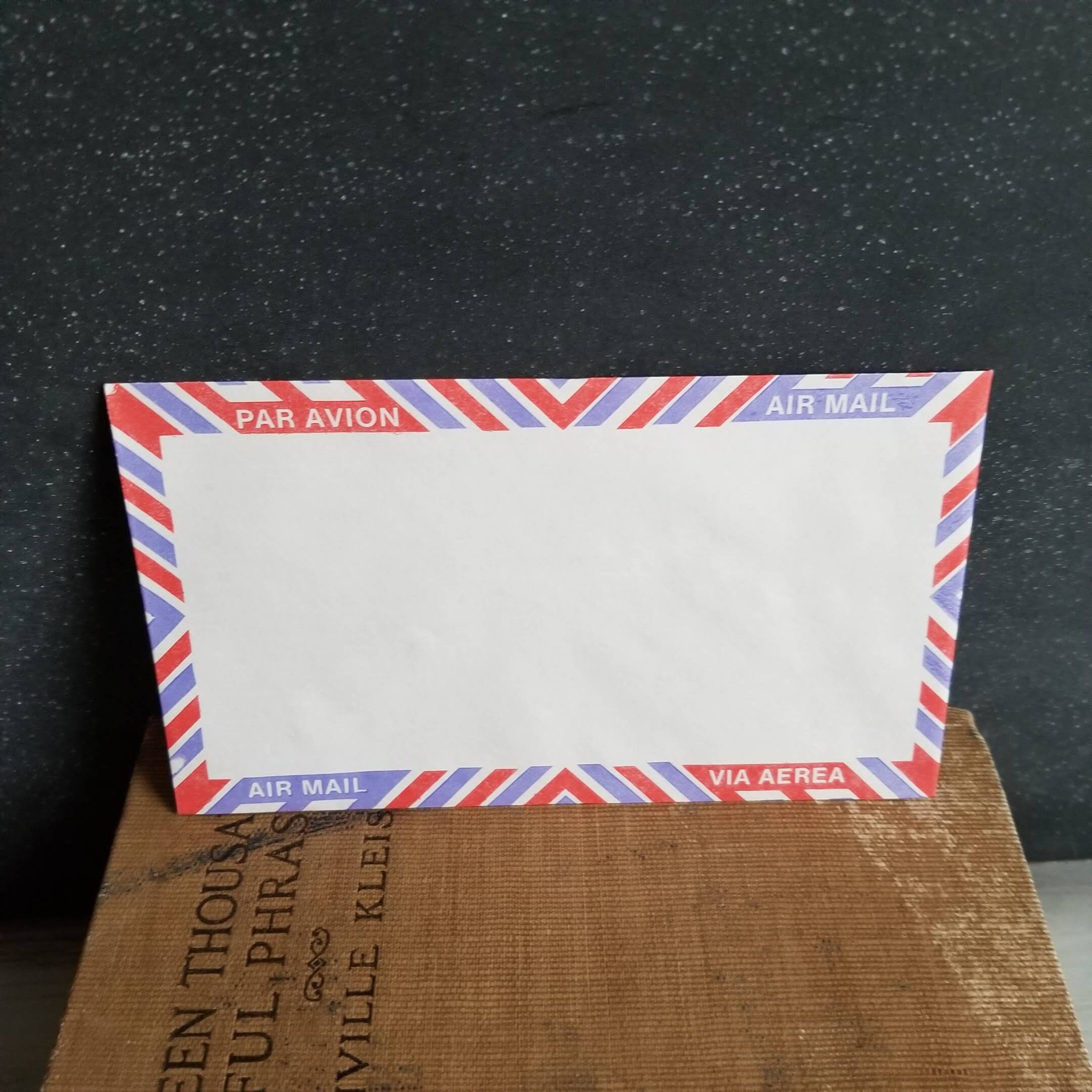 Vintage airmail envelopes in light purple/blue and red pattern.
