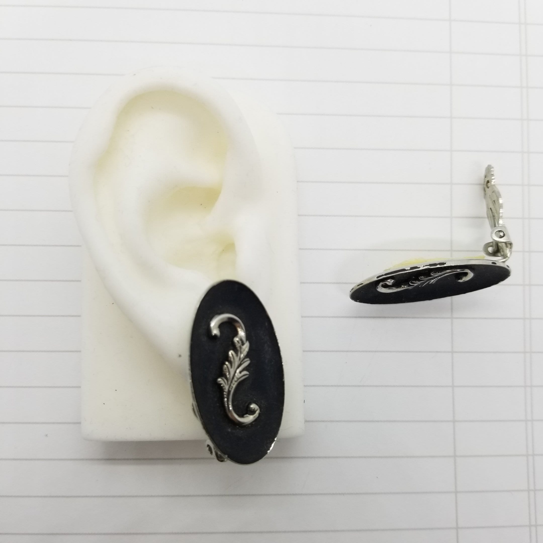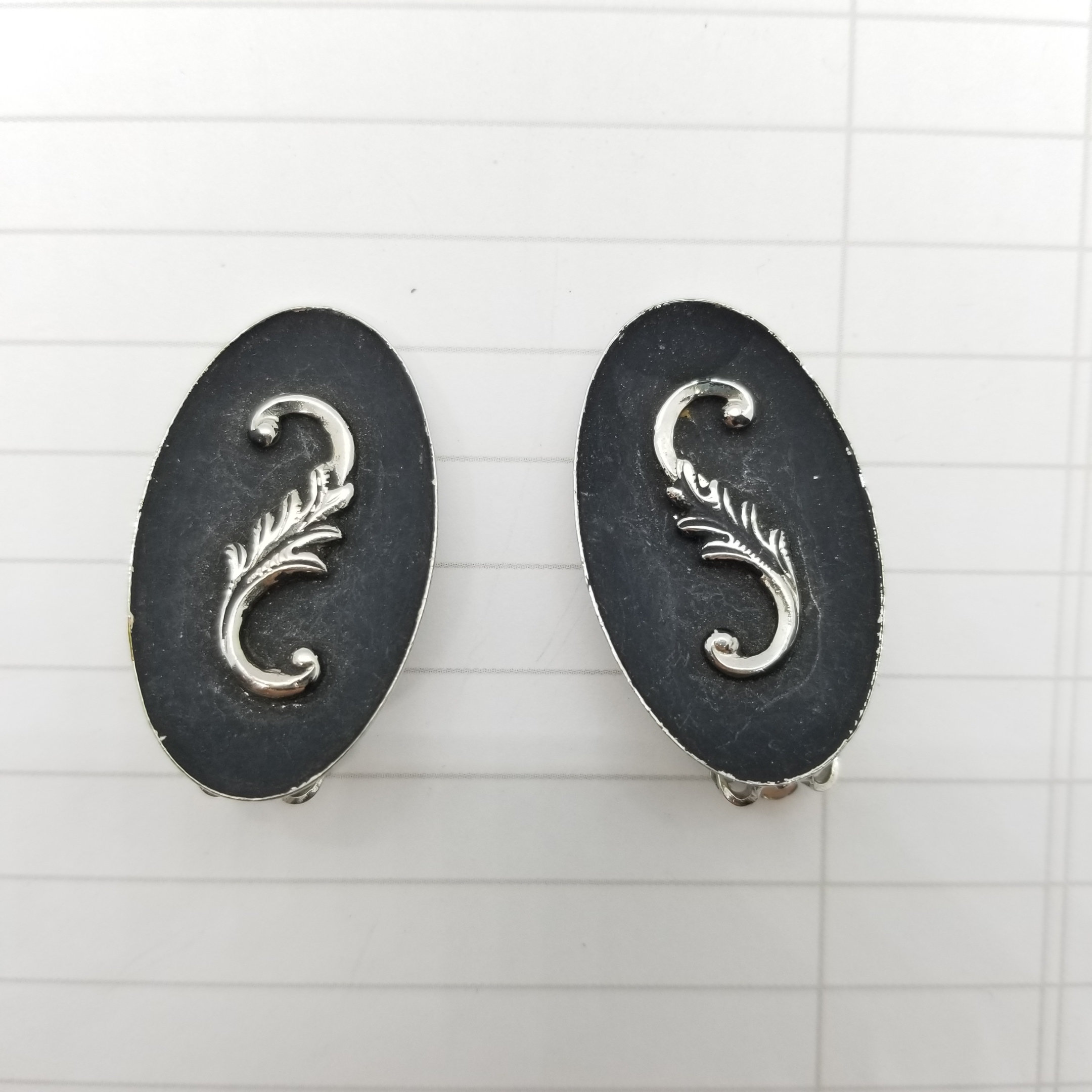 Vintage Black and Silver Scroll Clip On Earrings, Plastic Earrings, Silver and black Earrings. No markings.