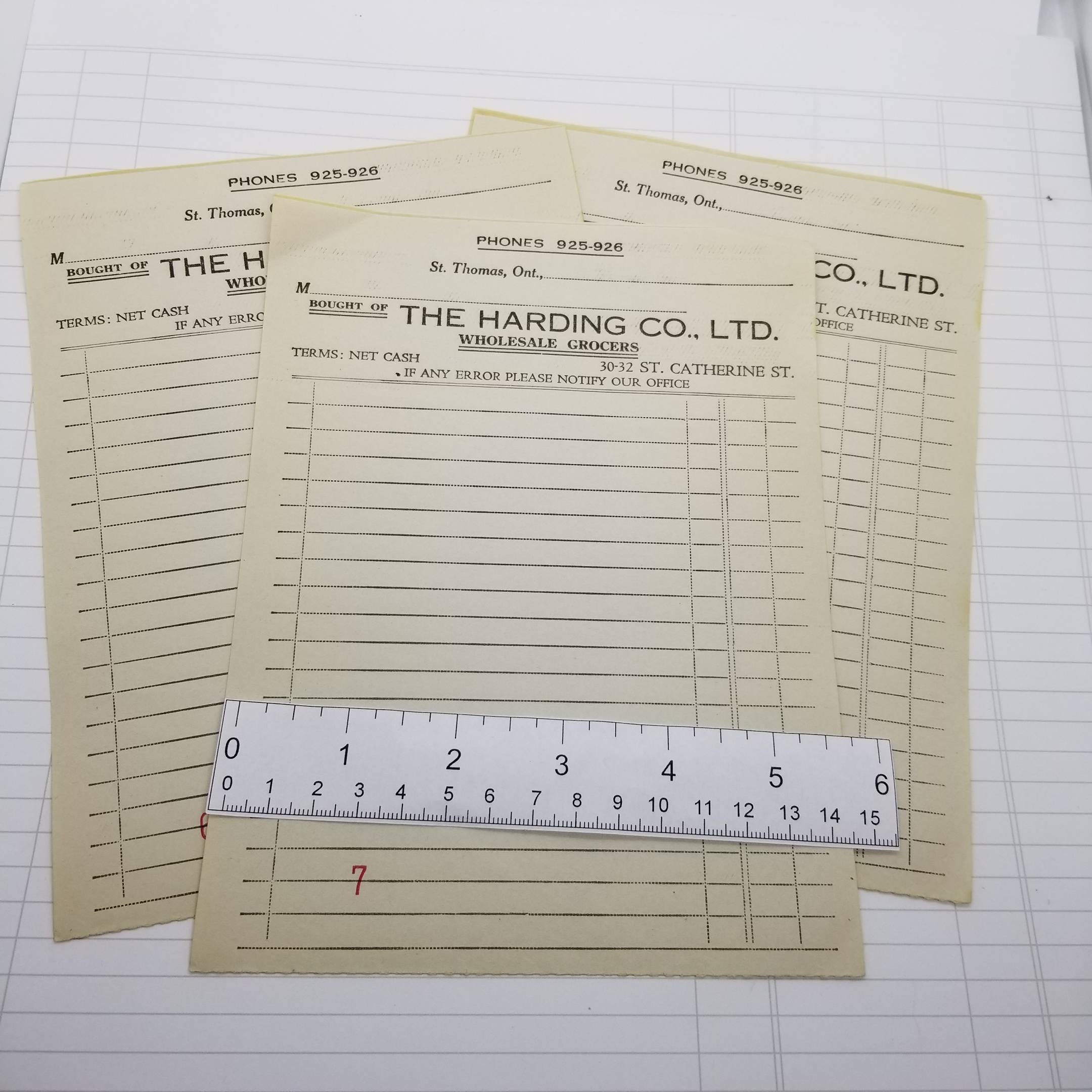 Great paper ephemera from St Thomas, Ontario. The Harding Co. Ltd Wholesale Grocers receipts, large size, 3 layers, 2 receipts, 1 tissue insert.