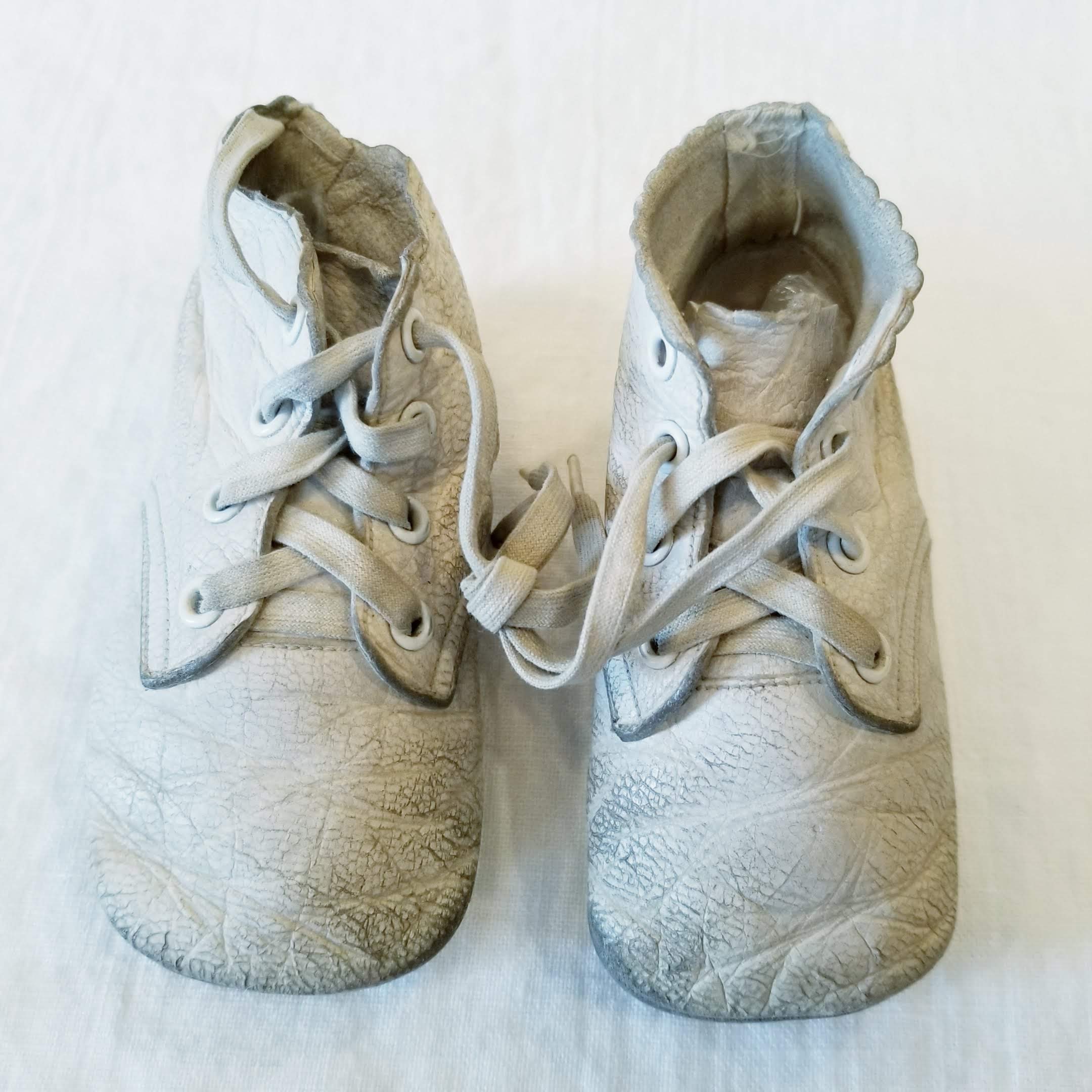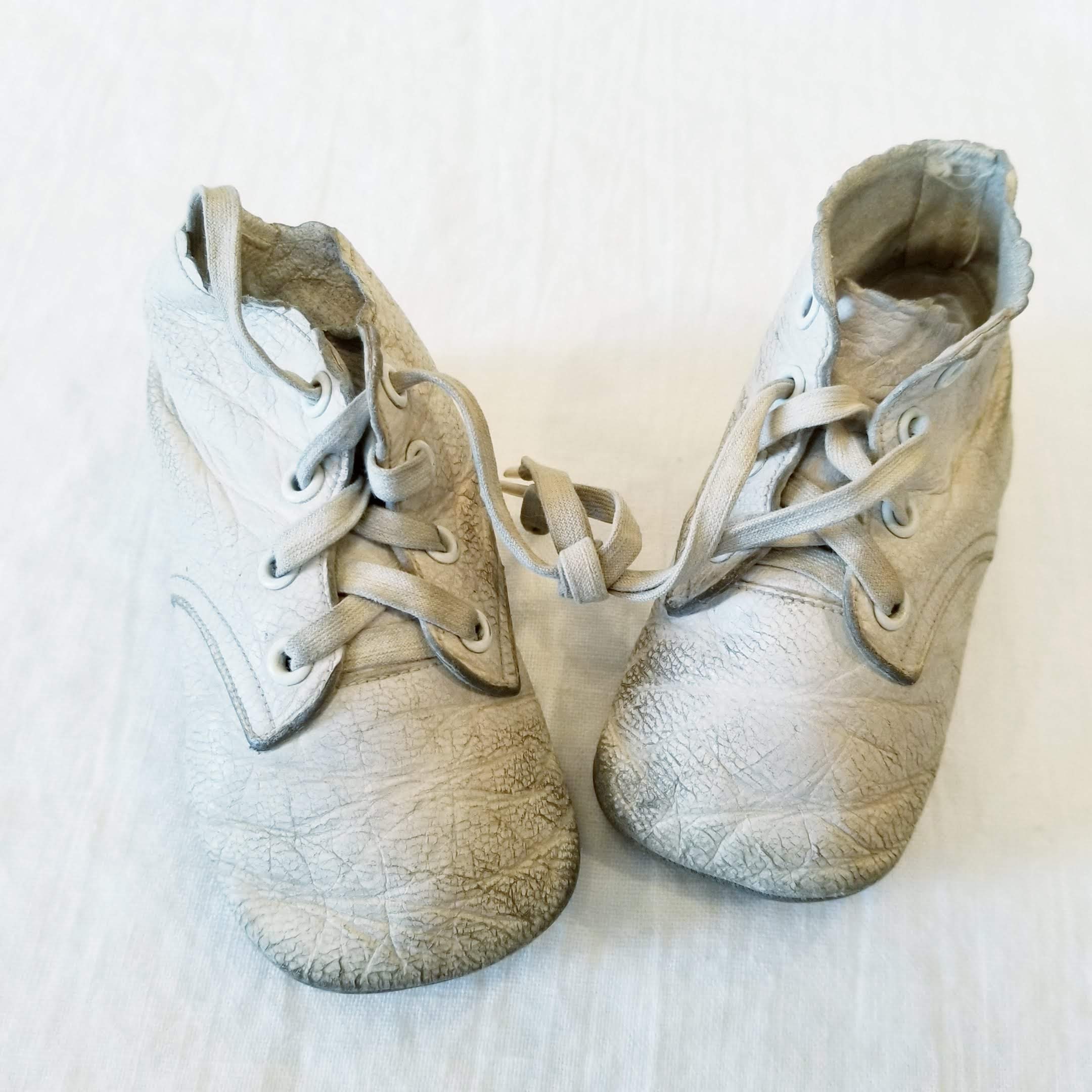 Vintage leather baby booties in white leather, so very cute, would be perfect in an assemblage art piece or a lovely little vignette featuring baby items.