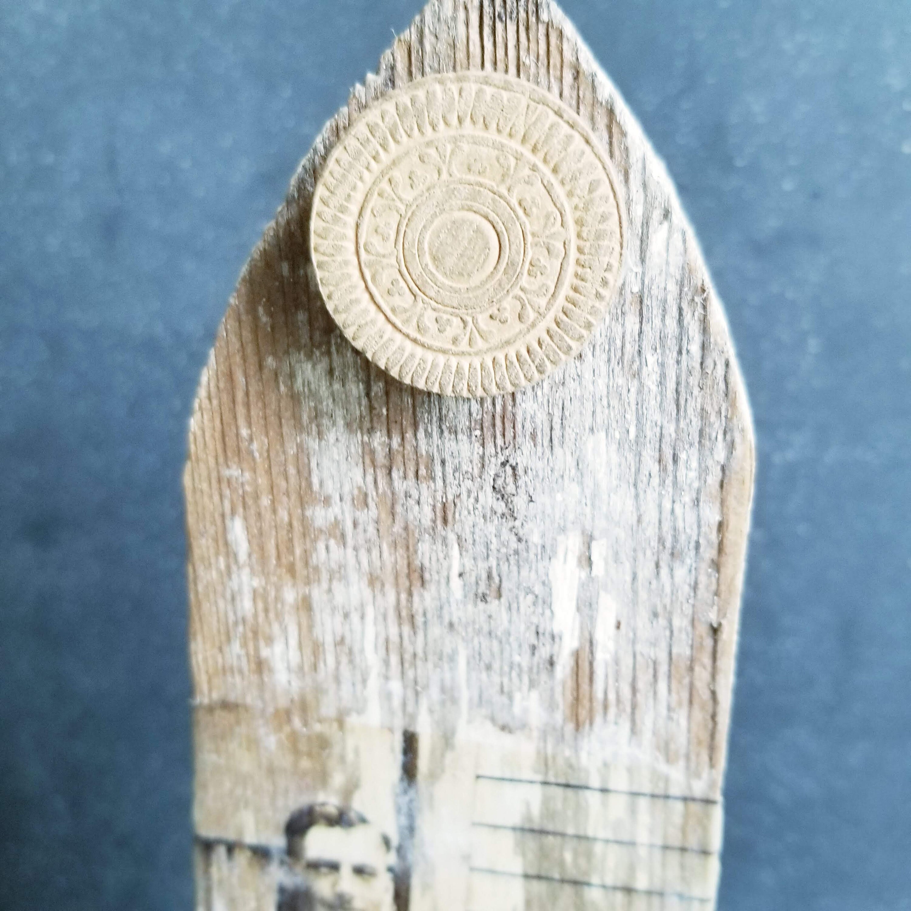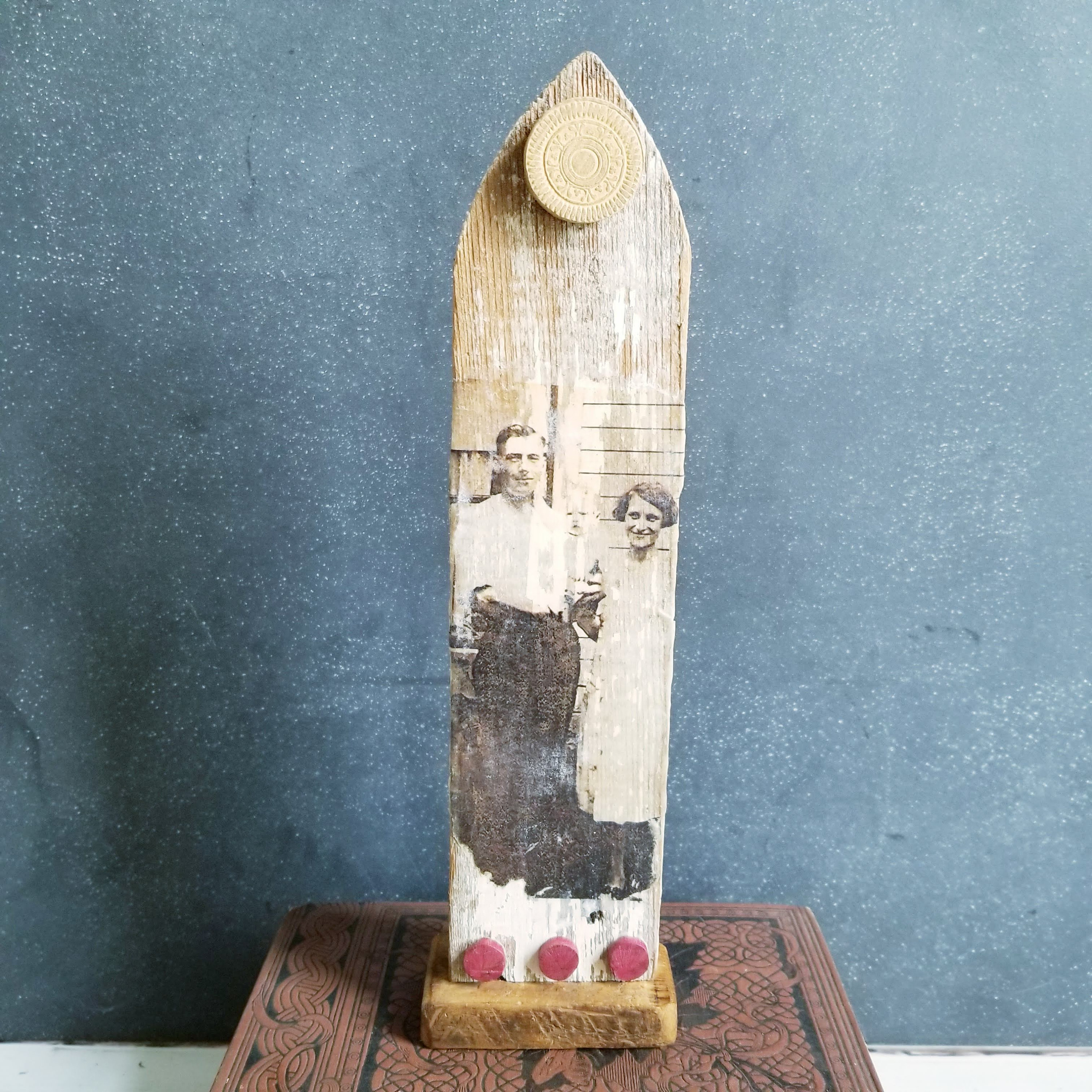 Remnants: Wooden assemblage on an old picket fence piece. Features a translucent image of a couple, the original paint of the picket shows through. Topped with wooden game pieces and set on top of a block of wood, you can place this on a shelf or table.