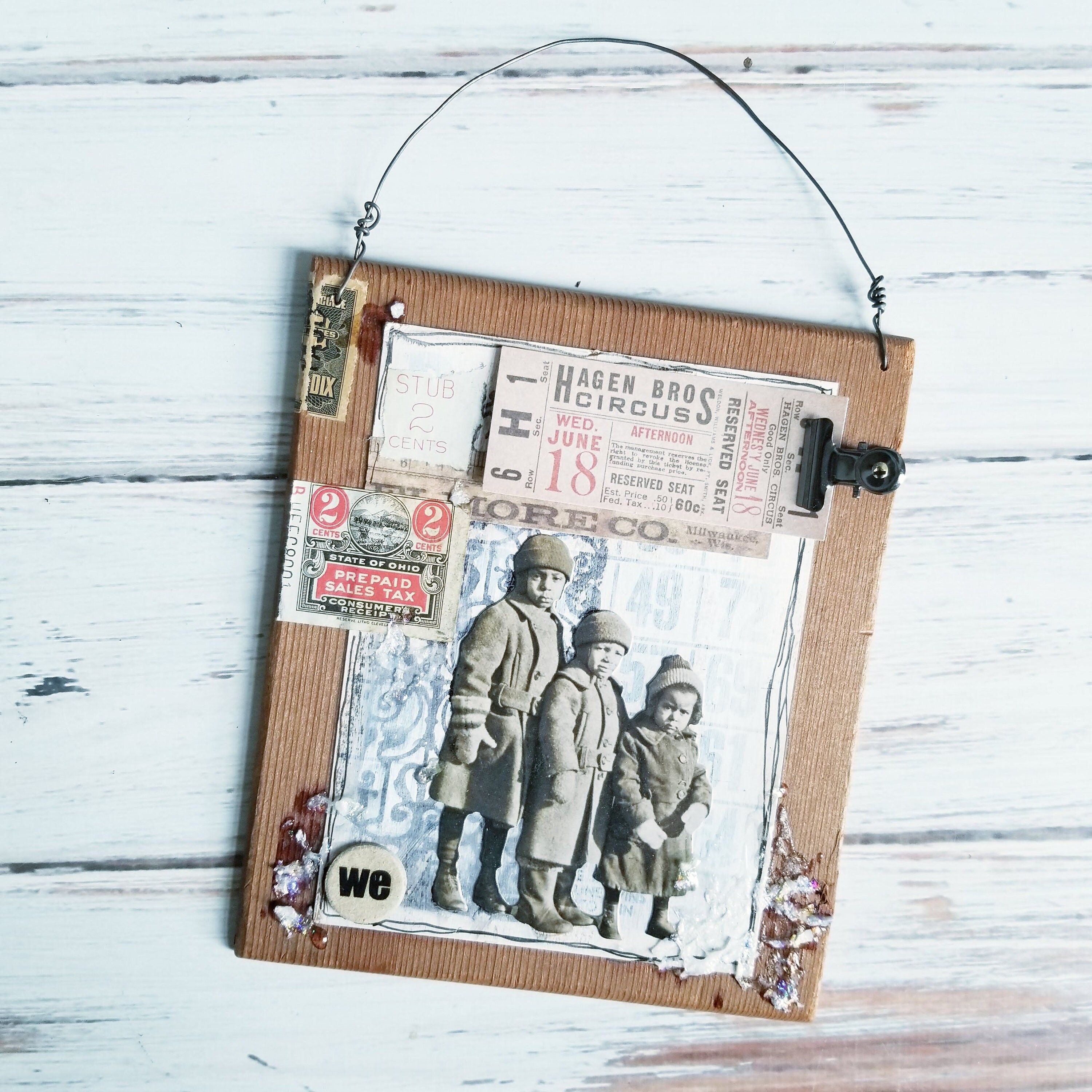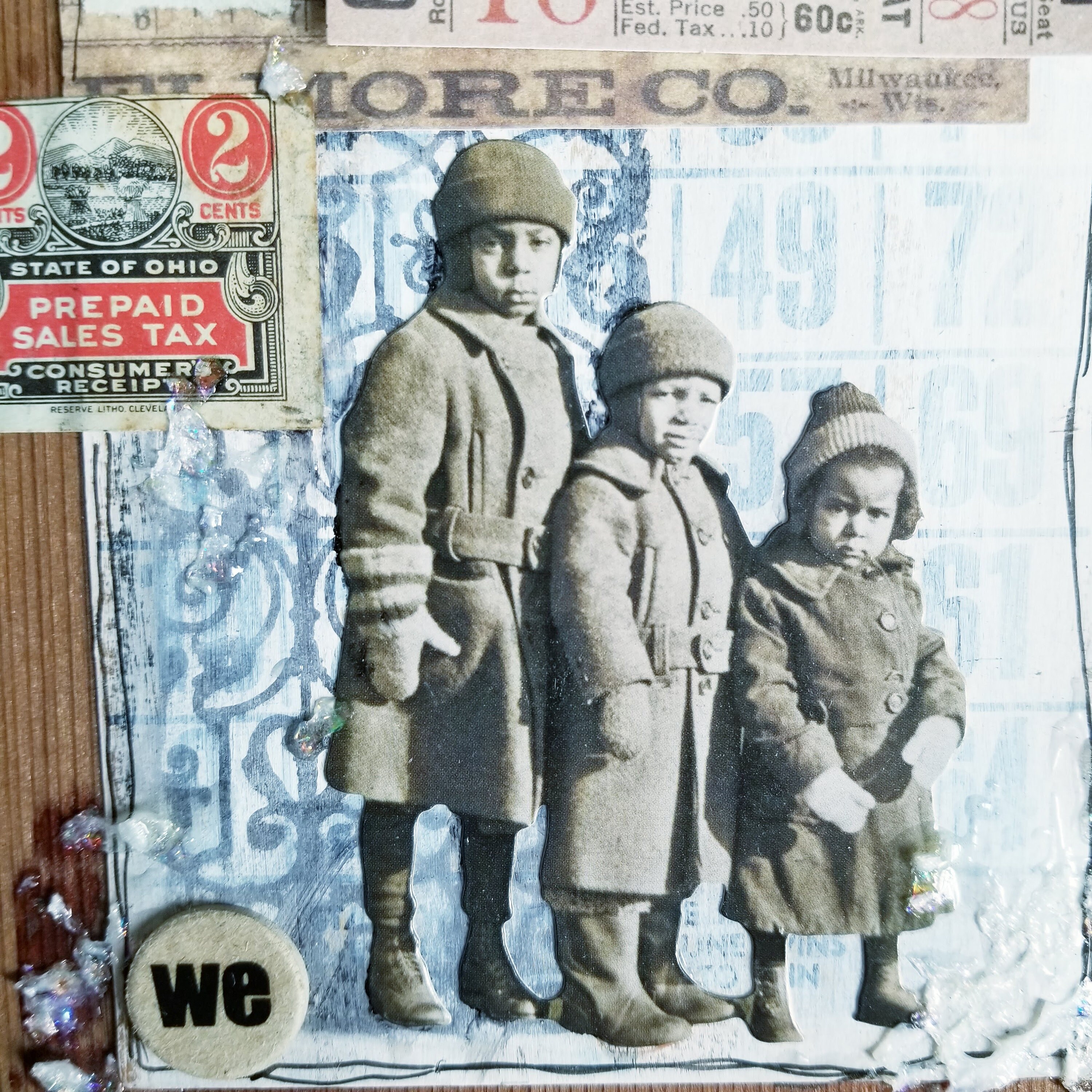 Snow Children Assemblage collage, created on a cigar box lid, repurposed with a vintage school book cover, collage of children, vintage ephemera.